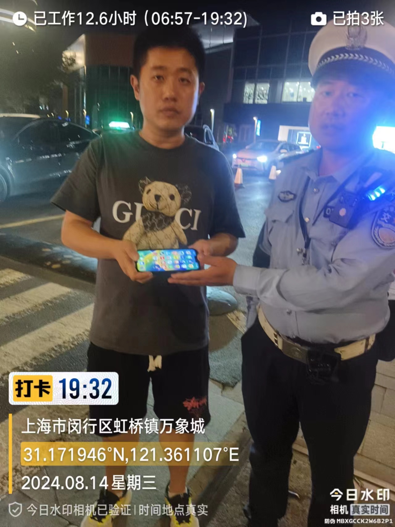 8月14日18:53,宗保公司駐閔行區(qū)虹橋交管輔助項目員工陳龍凱在吳中路紫藤路路口執(zhí)勤時,撿到一部蘋果手機,詢問周圍路人無人認領(lǐng)后,便將情況報告了項目隊長。