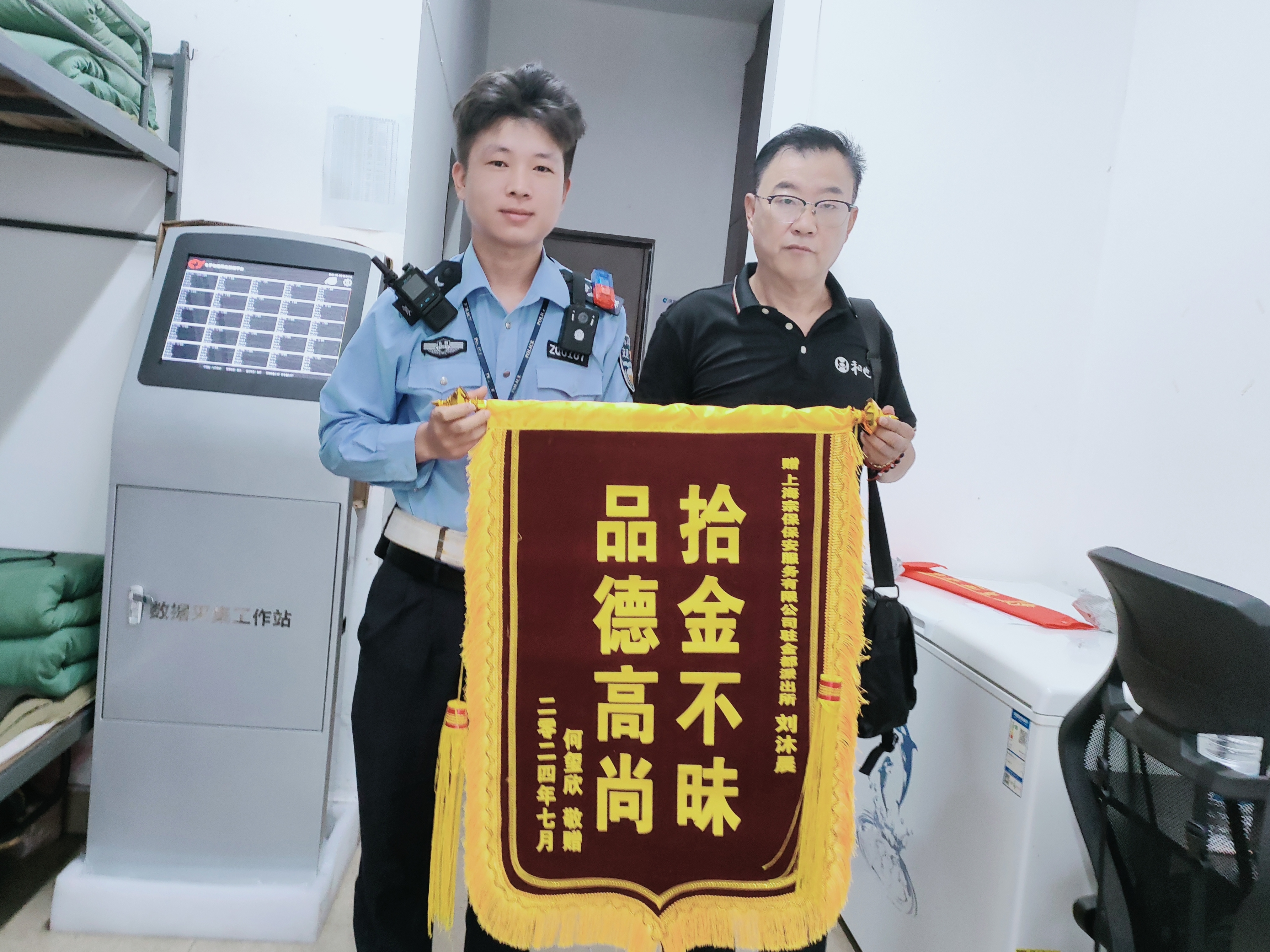8月8日,宗保公司駐閔行區(qū)莘莊工業(yè)區(qū)項(xiàng)目員工收到市民何先生送來的一面繡有“拾金不昧 品德高尚”的錦旗,感謝公司員工劉沐晨受托將7800元現(xiàn)金等物品轉(zhuǎn)交給自己的熱心行為。