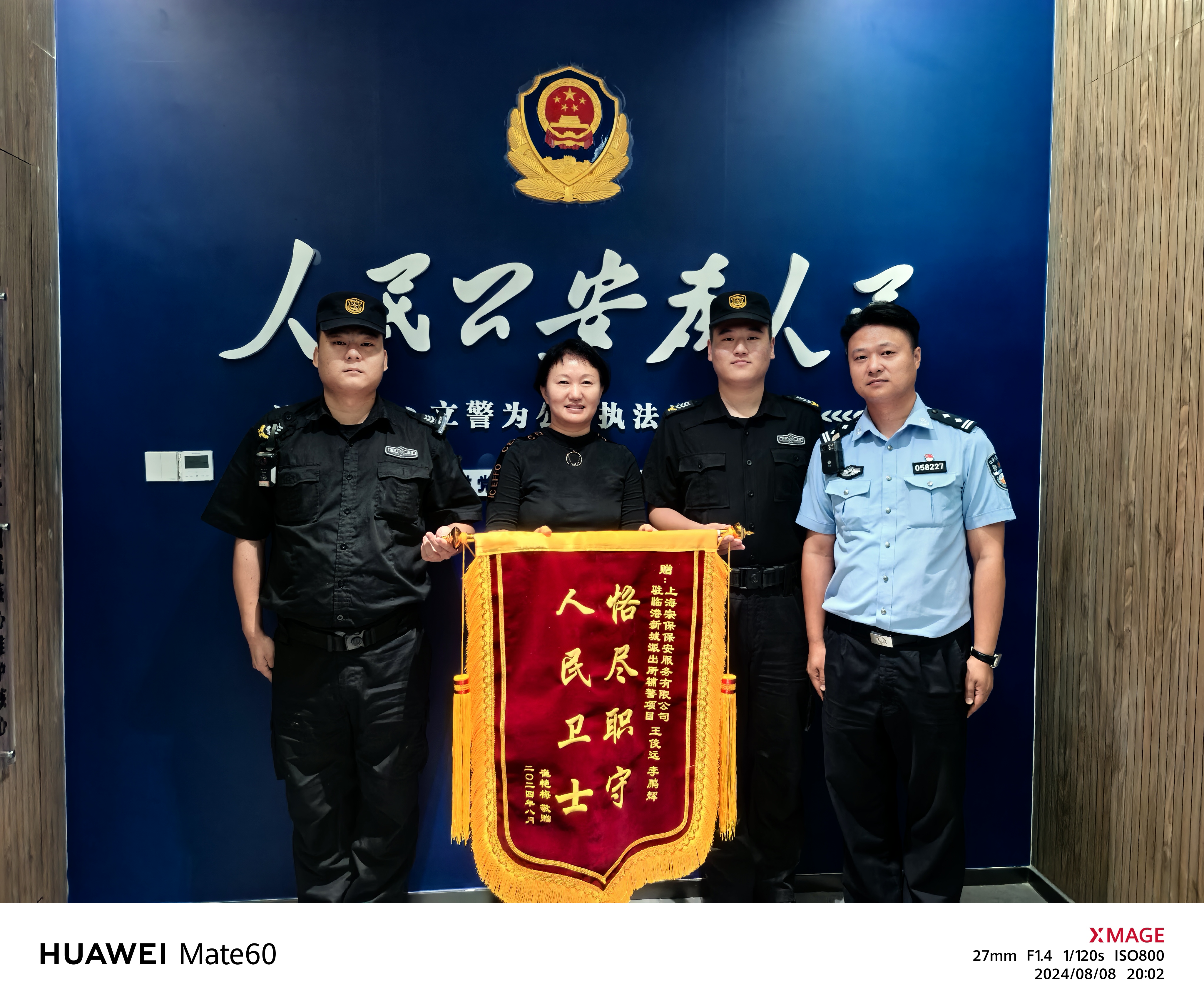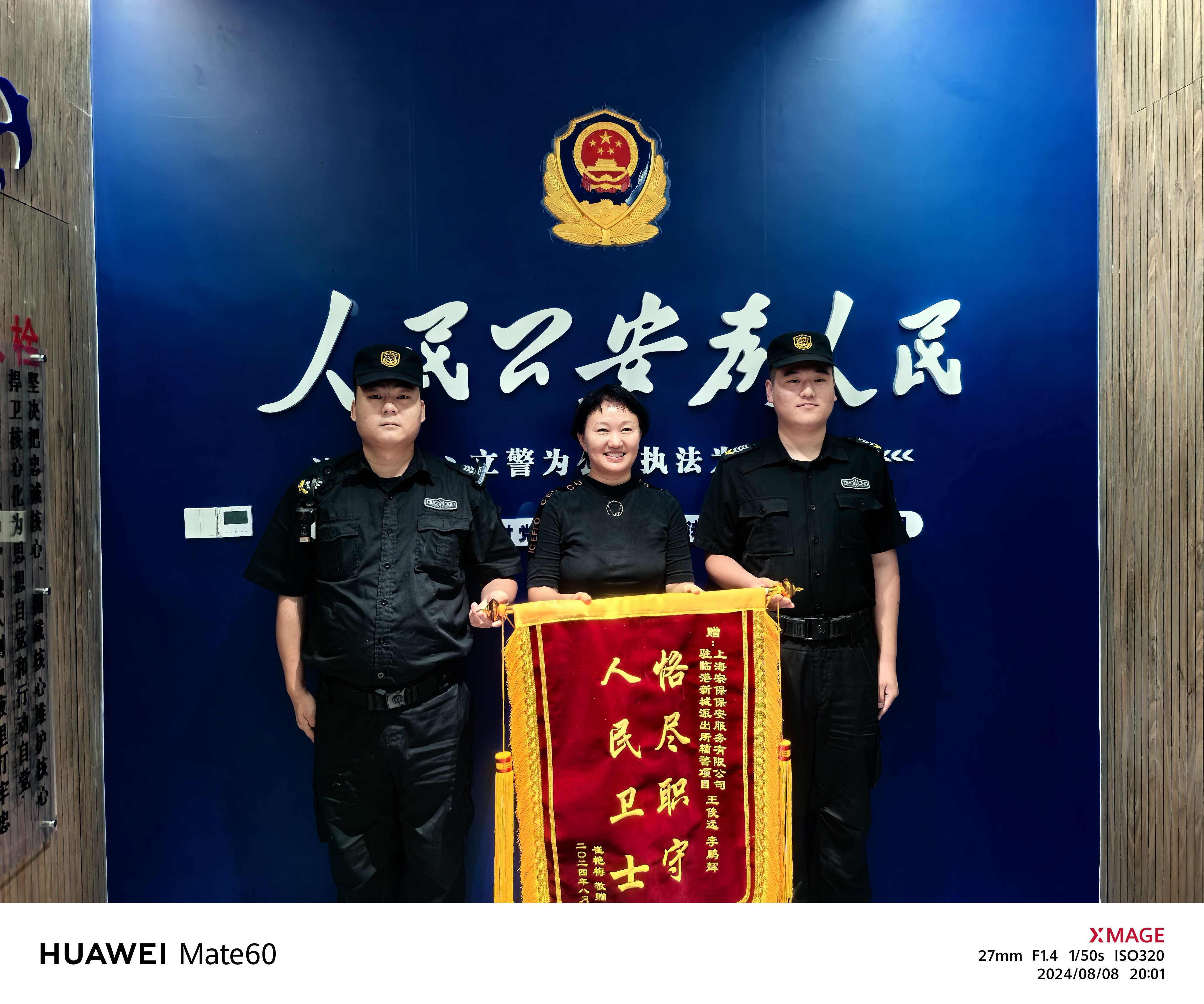 8月8日,宗保公司駐浦東新區(qū)臨港新城派出所輔助項(xiàng)目員工收到市民崔女士贈(zèng)送的一面繡有“恪盡職守 人民衛(wèi)士”的錦旗,感謝公司員工王俊遠(yuǎn)和李鵬輝幫助其女兒張女士的擔(dān)當(dāng)助人行為。