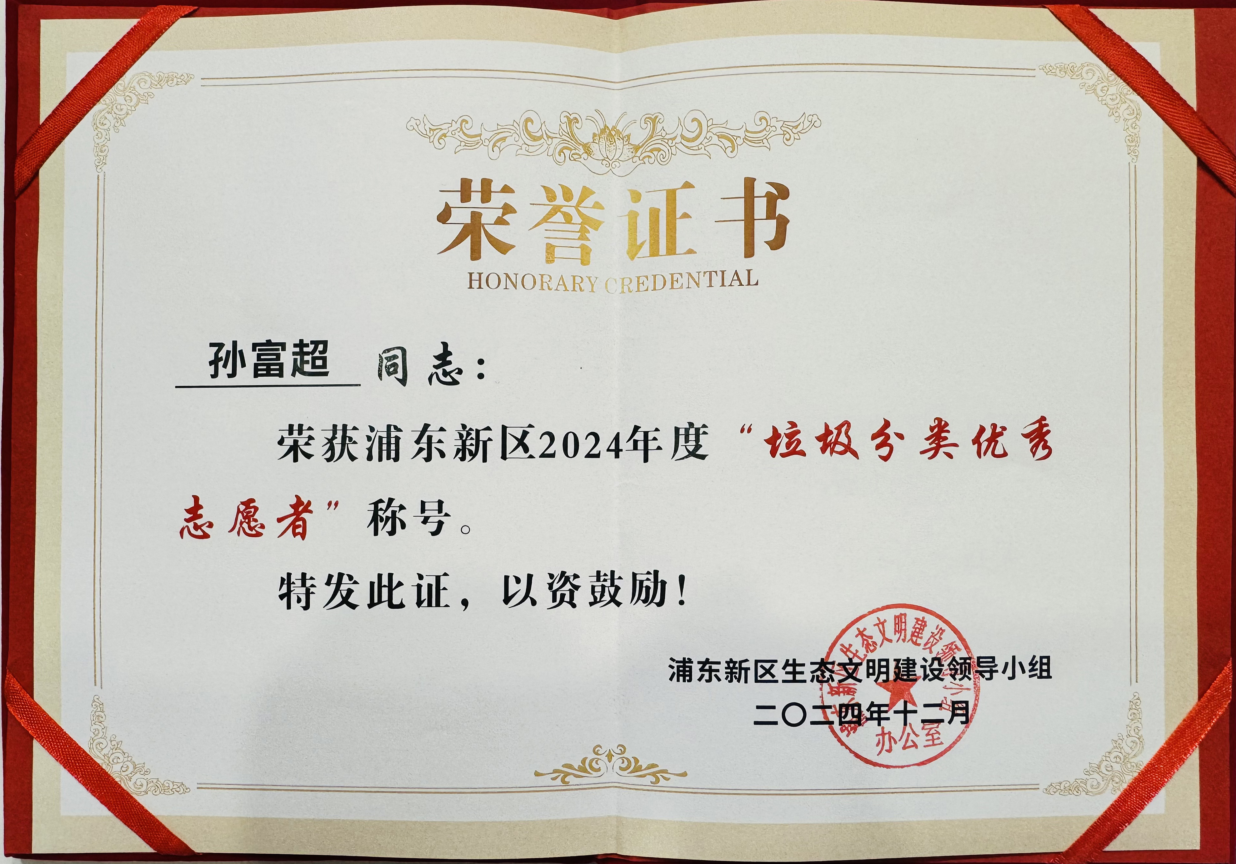 近日,宗保公司駐浦東新區(qū)陸家嘴街道社管辦小包垃圾巡查項(xiàng)目員工孫富超榮獲浦東新區(qū)2024年度 “垃圾分類優(yōu)秀志愿者”稱號(hào)。
