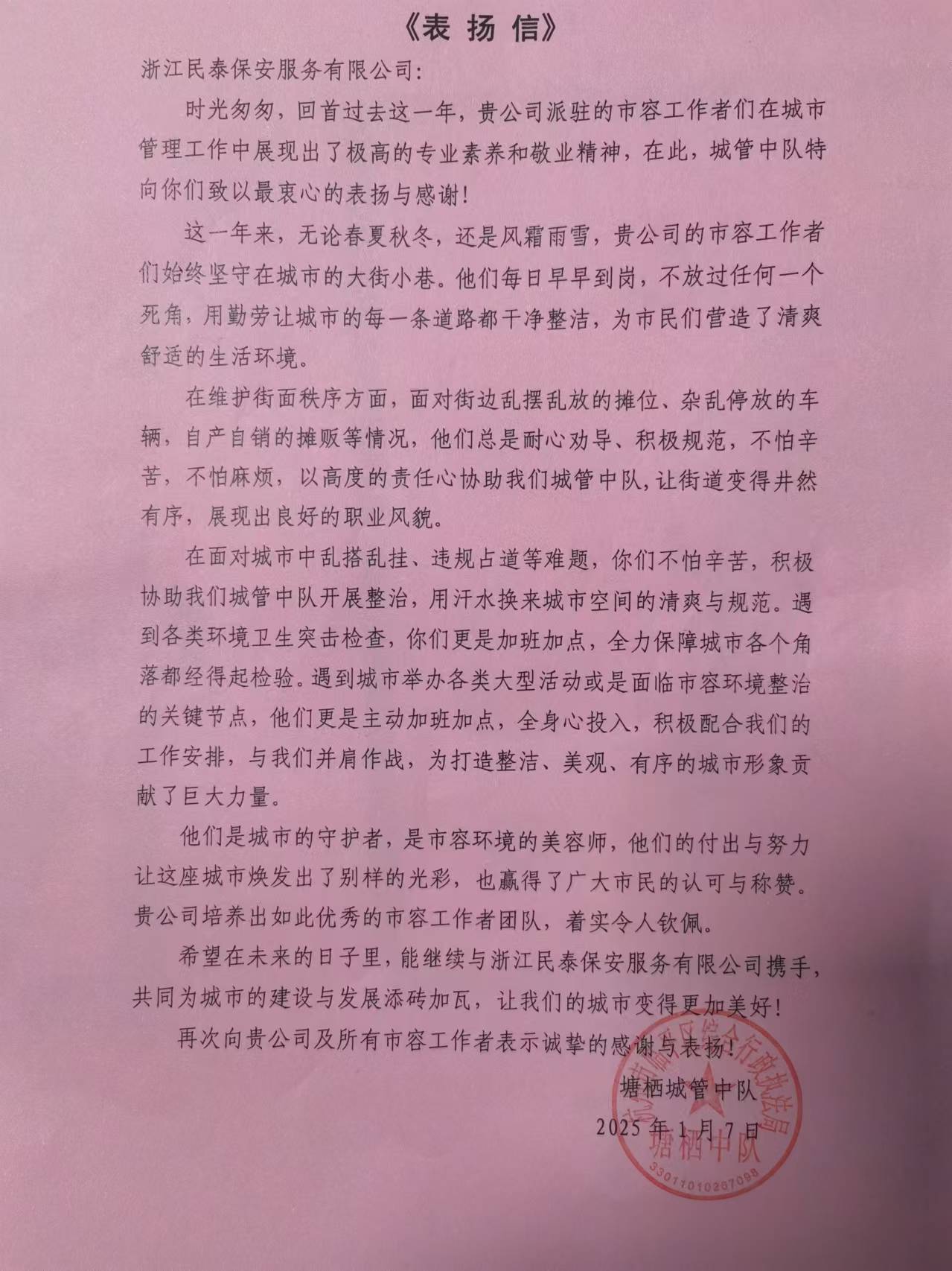 1月7日,浙江民泰公司駐杭州市臨平區(qū)塘棲城管中隊輔助項目收到塘棲城管中隊的表揚(yáng)信,感謝公司對塘棲城管中隊工作的大力支持和積極配合,表揚(yáng)公司項目員工勤懇扎實、盡心盡責(zé),為建設(shè)美麗塘棲付出的辛勤努力。