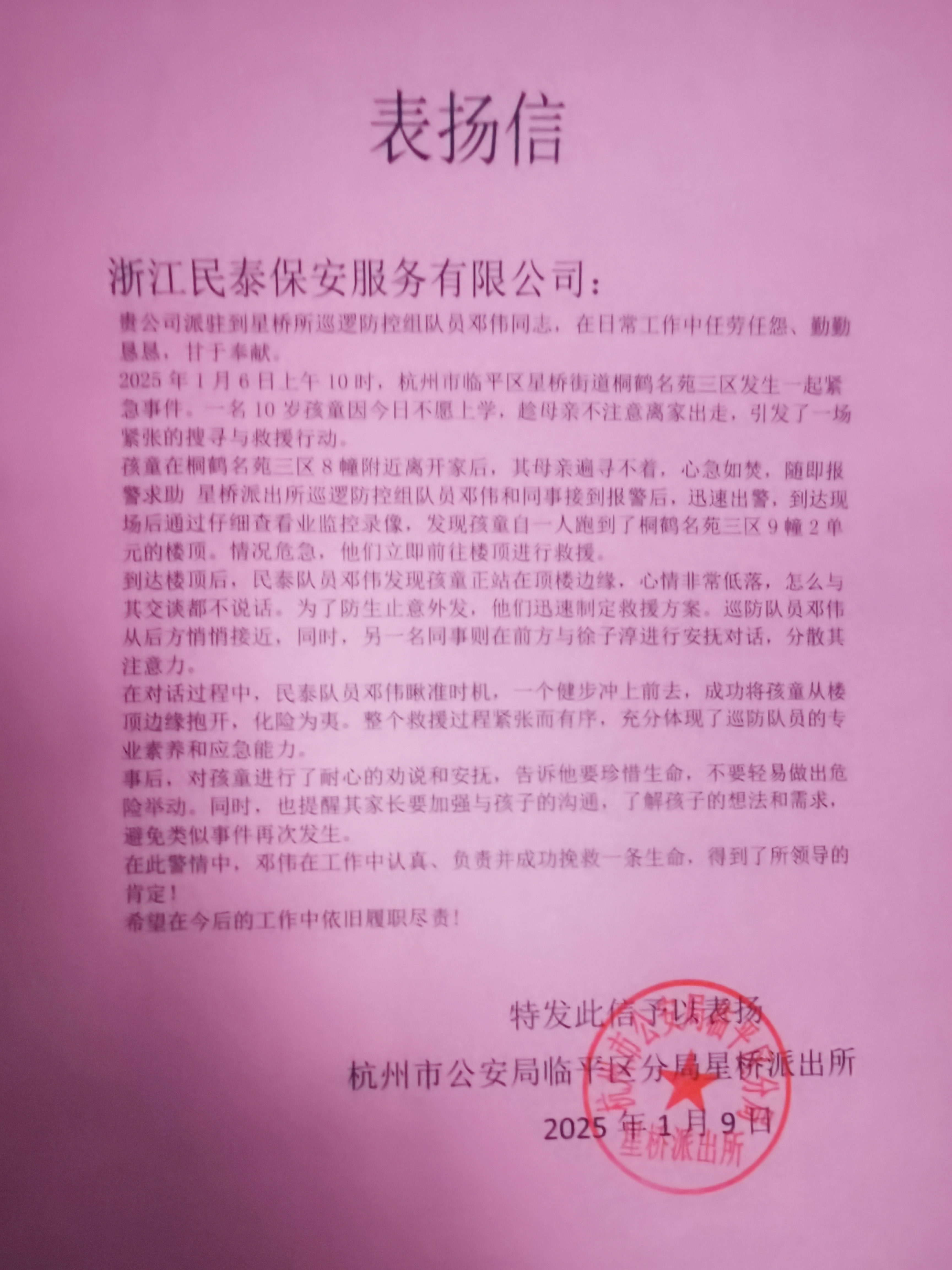 1月10日,浙江民泰公司收到杭州市公安局臨平區(qū)分局星橋派出所的一封表揚(yáng)信,信中感謝公司員工鄧偉成功救下一名欲跳樓輕生孩童,挽救其生命的行為,對公司員工鄧偉不顧安危、擔(dān)當(dāng)善為的精神給予充分肯定和贊揚(yáng)。