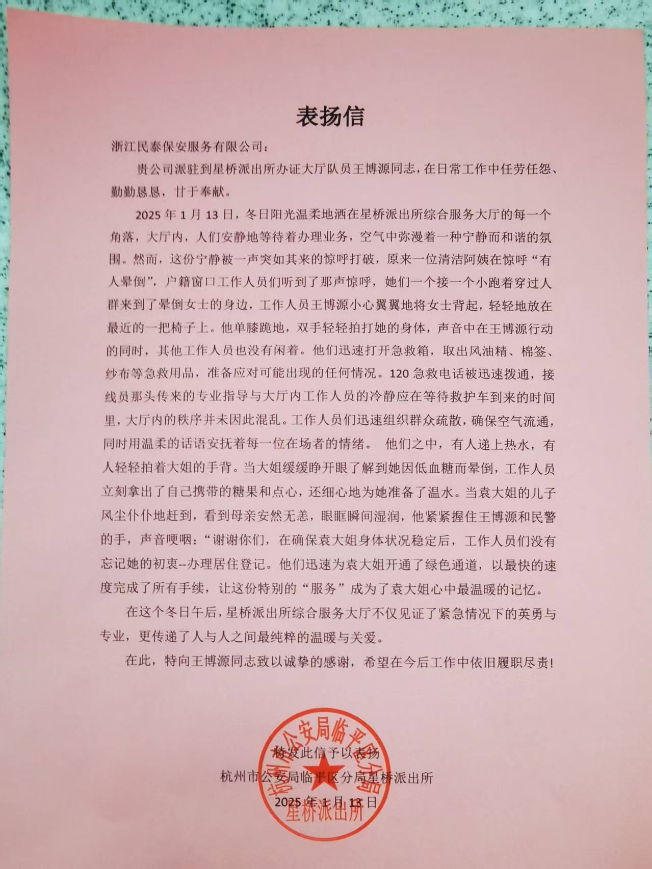1月17日,浙江民泰公司收到杭州市公安局臨平區(qū)分局星橋派出所的表揚(yáng)信,信中對公司員工王博源熱心救助暈倒阿姨的暖心舉動給予了高度贊揚(yáng)。