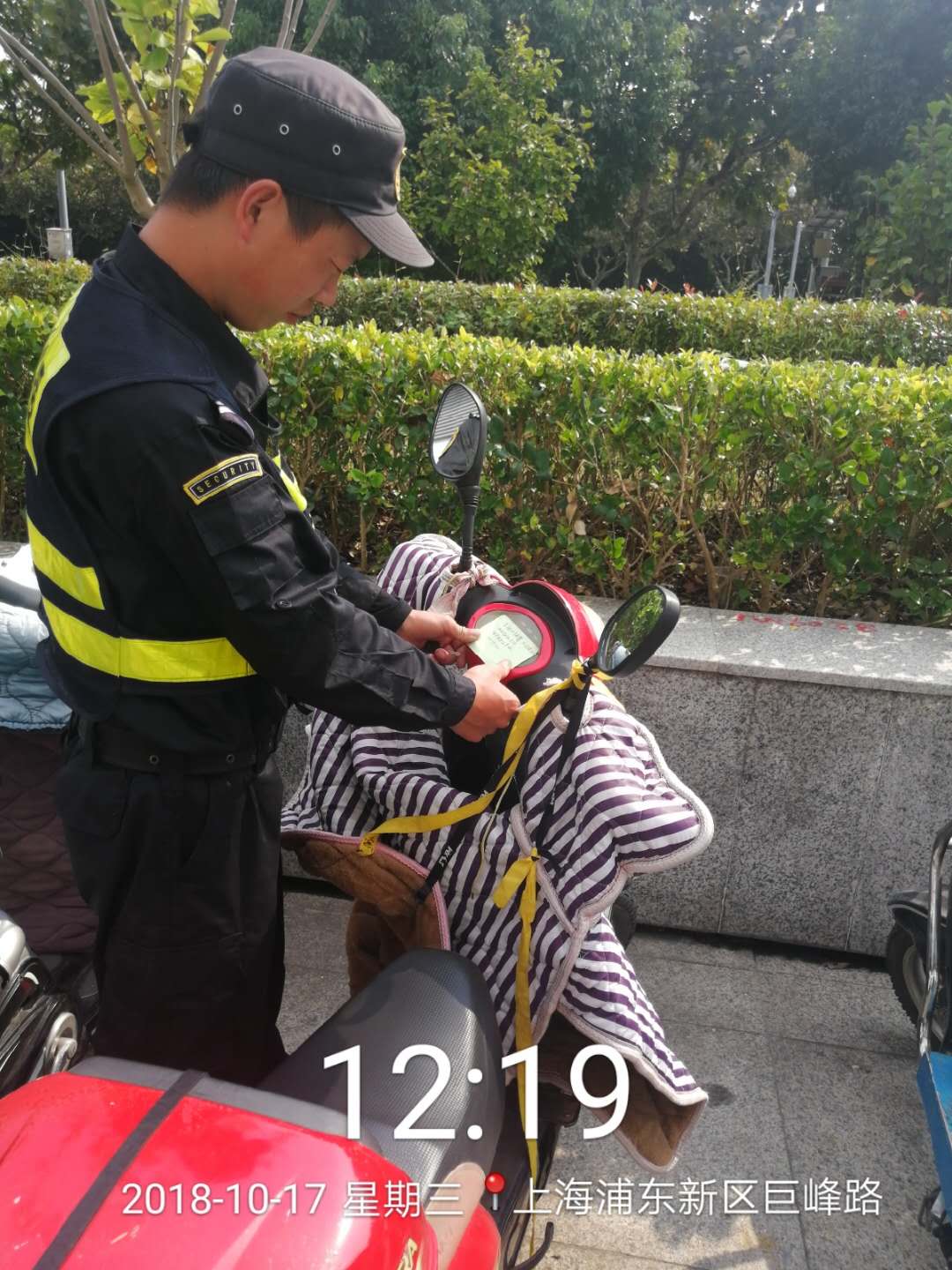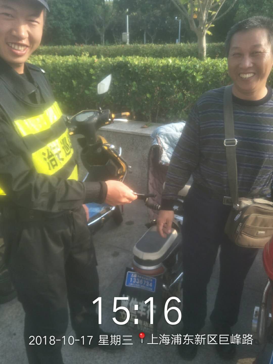 2018年10月17日,宗保公司金橋所輔警項目隊員王峰峰、陳友明在申江路執(zhí)勤期間,發(fā)現(xiàn)一輛電動車鑰匙沒有拔,而電動車主人也沒有在現(xiàn)場。兩人上報當日值班后,為了防止電動車丟失,拔掉鑰匙暫時保管,并用便簽紙寫了自己聯(lián)系方式貼于電動車儀表盤,提醒車主如何領取鑰匙。