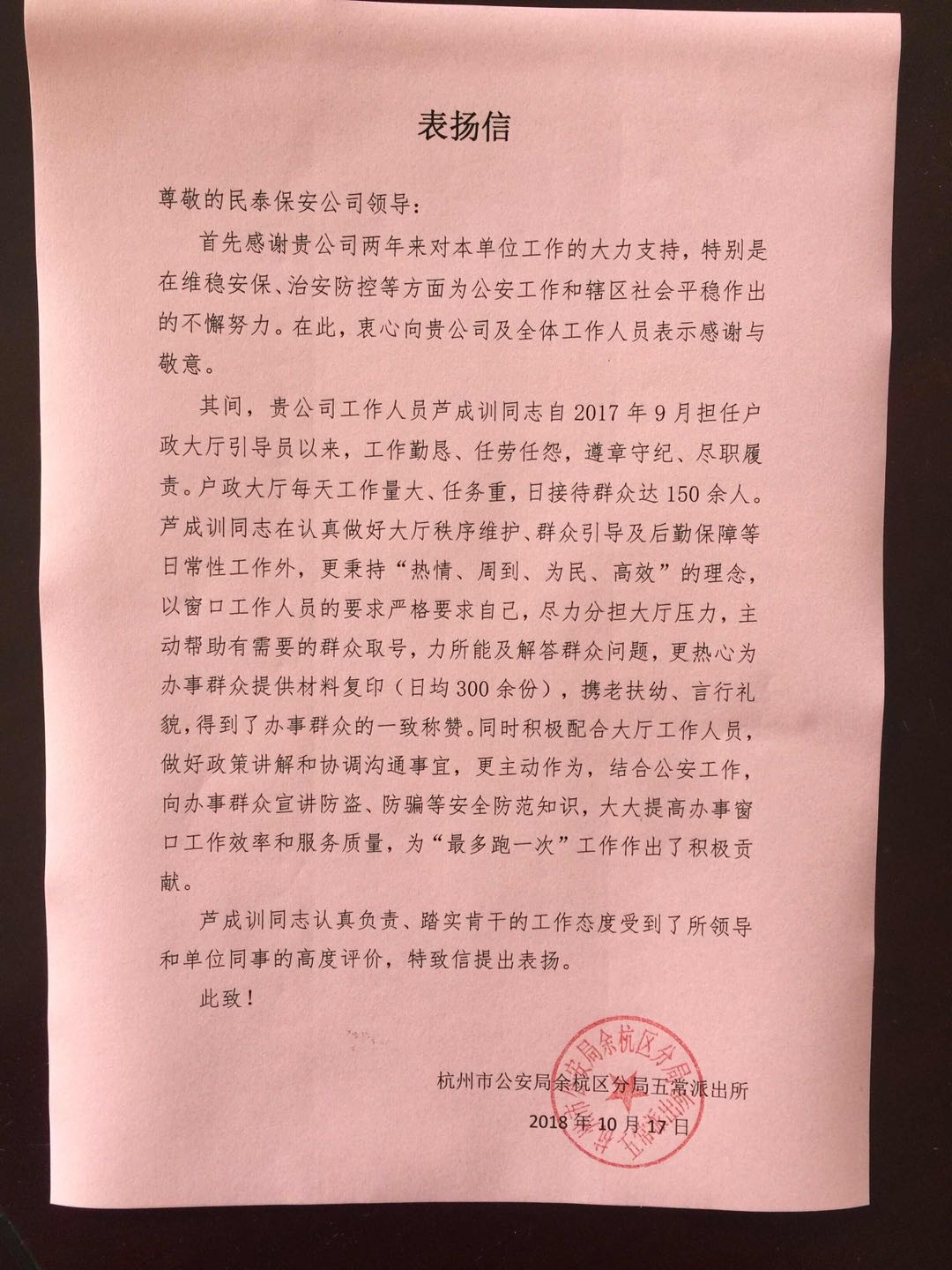 2018年10月18日,浙江民泰保安公司(上海宗保保安服務(wù)有限公司)收到一封來(lái)自杭州市公安局余杭區(qū)分局五常派出所的表?yè)P(yáng)信。