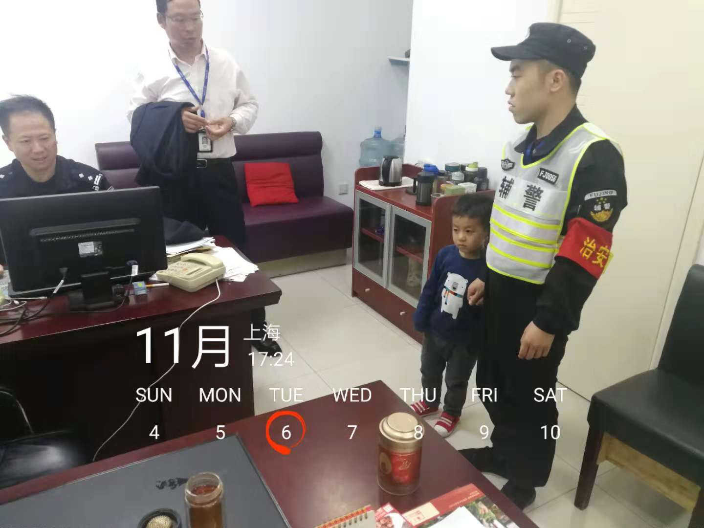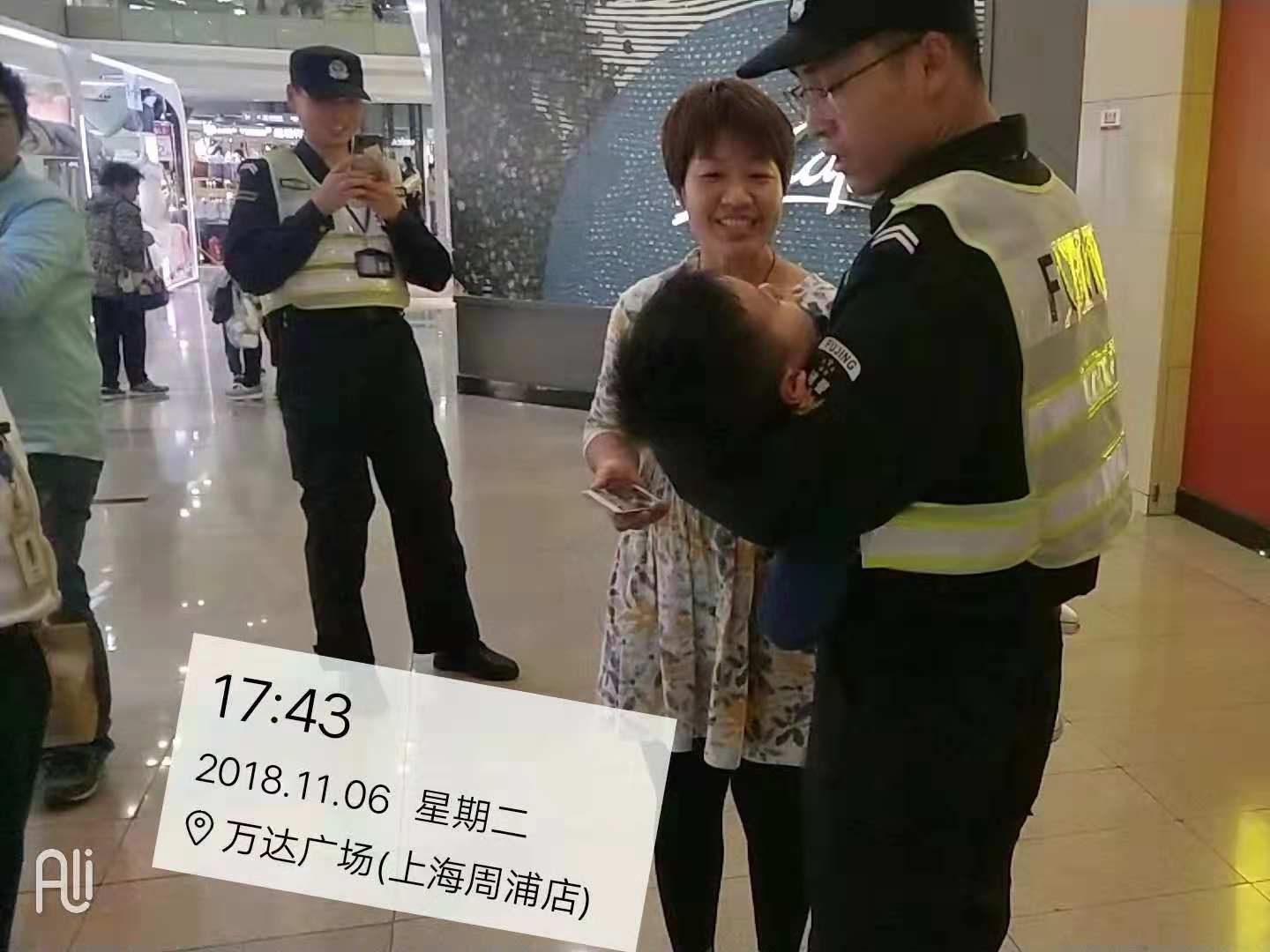 當(dāng)天下午,宗保隊員薛建如在周浦萬達巡邏期間,發(fā)現(xiàn)一名小男孩躲在一個角落里在哭。經(jīng)詢問得知,小孩子多兩歲,與母親在萬達逛街時走散。由于年齡較小,講不出父母名字和聯(lián)系方式。薛建如立即把這一情況上報帶班組長苗靖,并安撫小朋友,將小朋友帶至萬達警務(wù)站。