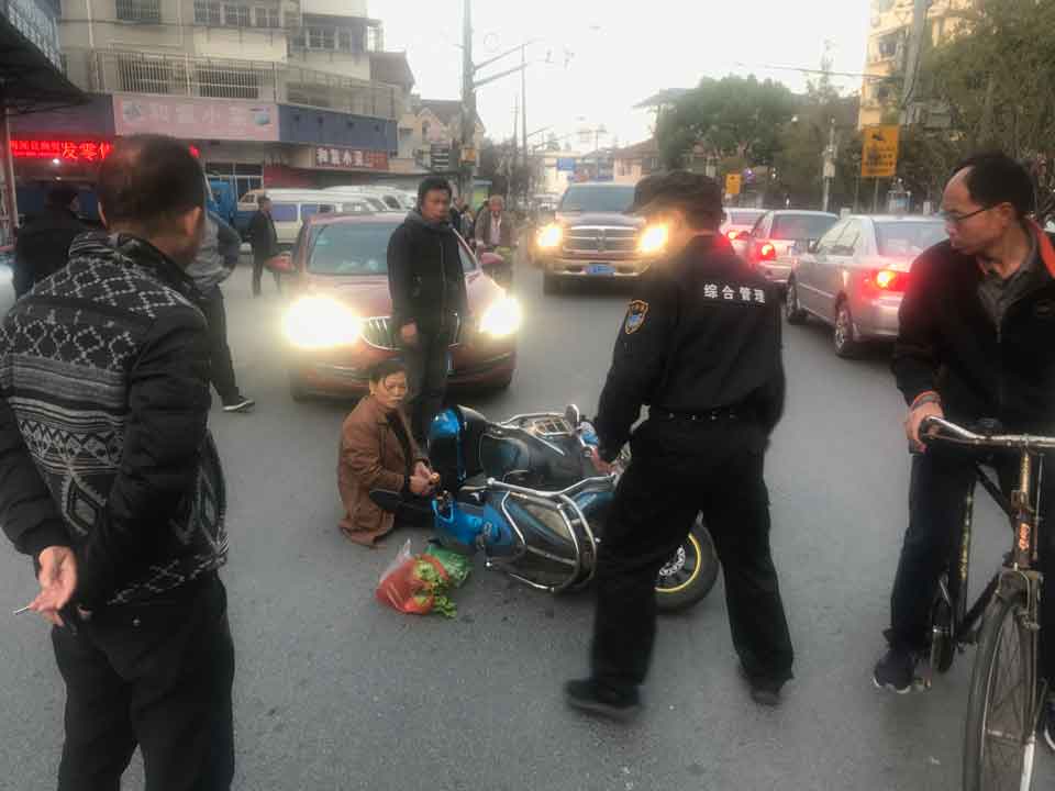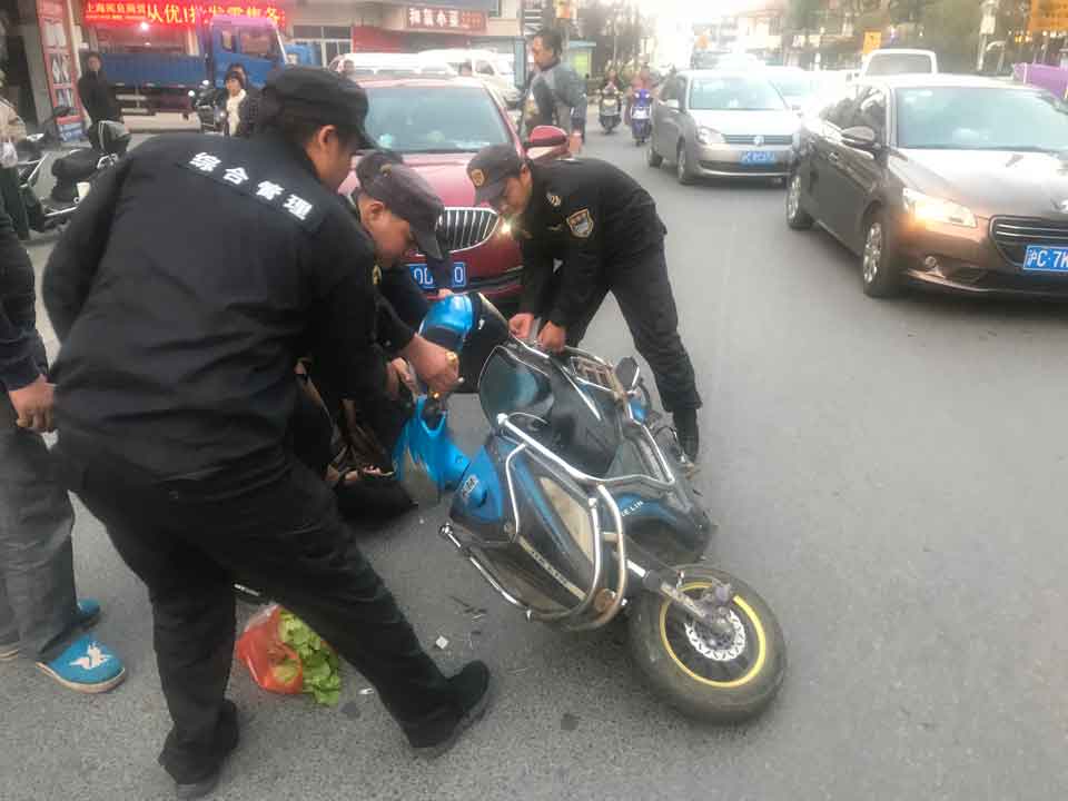 當(dāng)天下午16:00左右,黃路社區(qū)隊員秦泗彬、湯紅強、朱清科、劉偉、陶永錦等在上班巡邏期間,發(fā)現(xiàn)在川南奉公路振興路路口10米處發(fā)生一起轎車與電瓶刮撞事故,該事故造成道路封堵。正是下班高峰期,五名隊員立馬下車幫助當(dāng)事人報警,并勸導(dǎo)兩名當(dāng)事人拍好照片,取好證,讓當(dāng)事人車輛停靠路邊。接下來,五名隊員指引擁堵車輛有序通行,使交通慢慢恢復(fù)暢通。