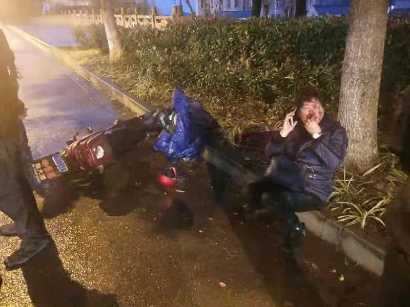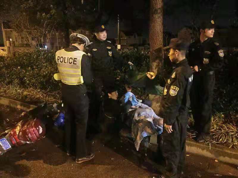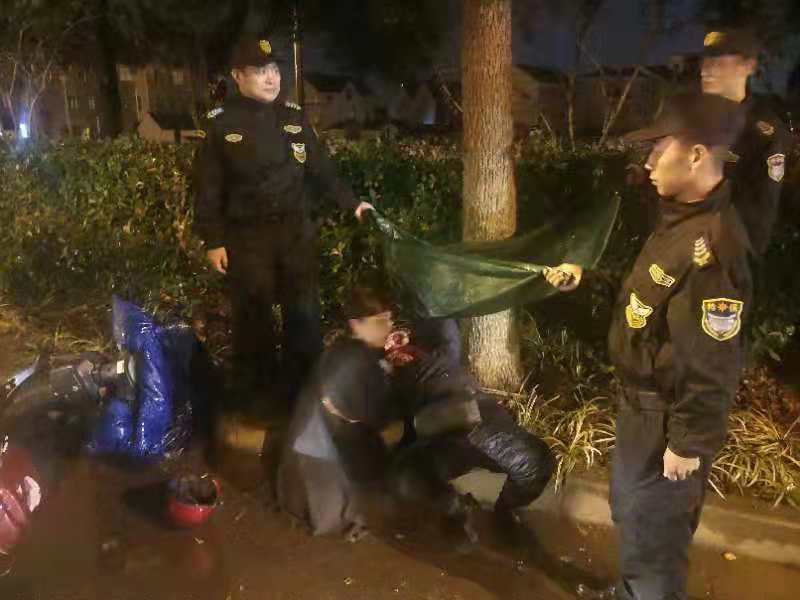 當天下午17:00左右,王飛,劉兵,周支鴻,張亮亮,馬勇飛等隊員在下班途中,經南團公路到達東四灶港橋附近時,發(fā)現(xiàn)路邊綠化帶上一行人連同電瓶車倒在地上。隊員們立即停車下去查看,發(fā)現(xiàn)是一位老太太,因雨天路滑騎車摔倒在地上。當時其嘴部鮮血較多,語言表達不清。根據(jù)當時情況,隊員第一時間撥打了110和120急救電話,然后上前與老人一番溝通,最終通過老人的手機與其家人取得了聯(lián)系。在等待救援和家人的過程中,老人躺在地上哭泣。因天氣一直下著小雨,隊員拿來雨衣?lián)卧诶先松砩蠟槠鋼跤辏刈o在老人身邊,直至警察、急救人員、家屬到現(xiàn)場后,合力將老人送到救護車上。