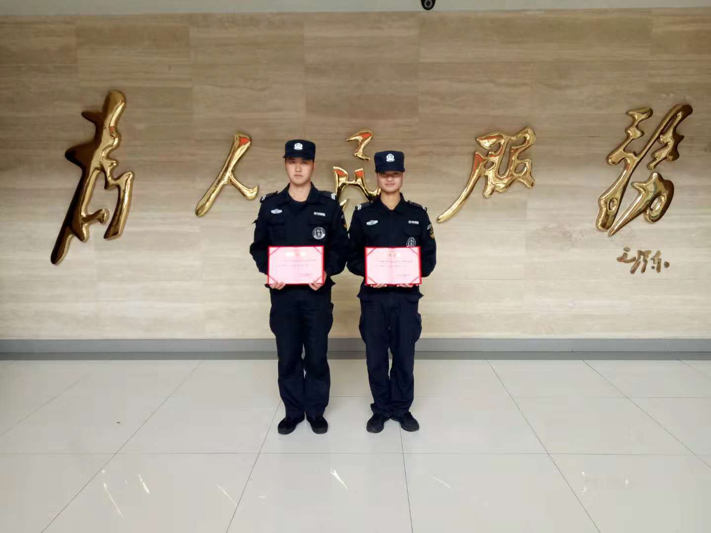 11月20日下午,民泰(宗保)五常項(xiàng)目特保隊(duì)員張小龍和潘森林拿著優(yōu)秀學(xué)員證書(shū),激動(dòng)萬(wàn)分。