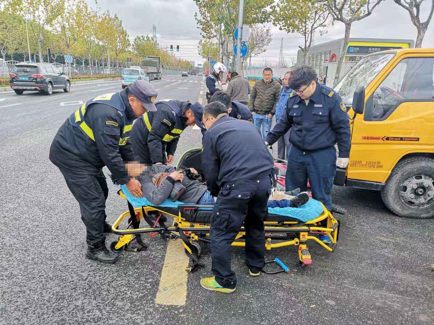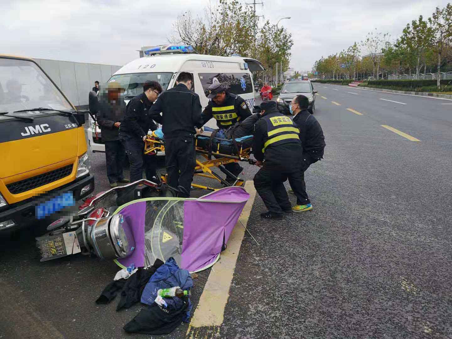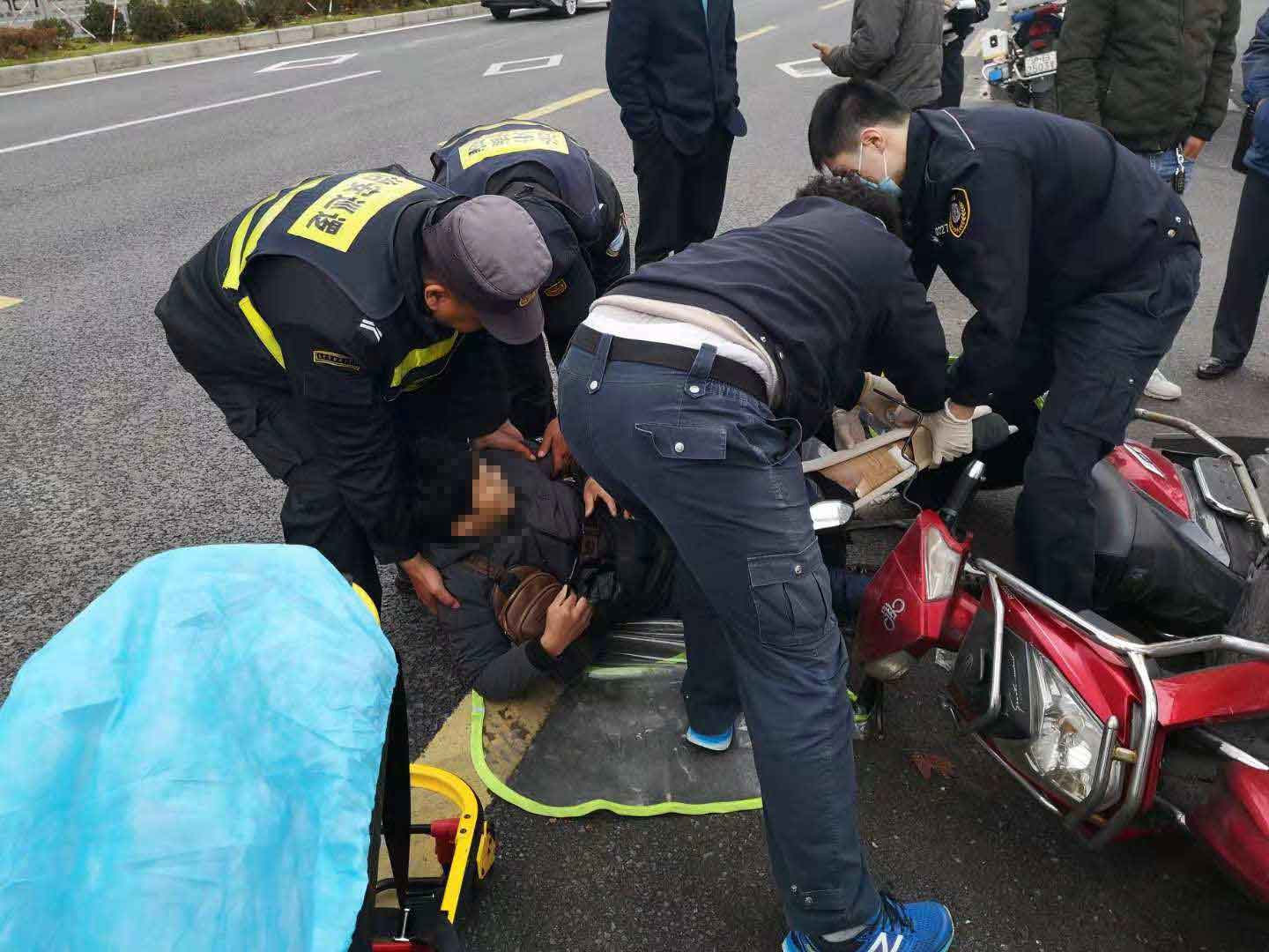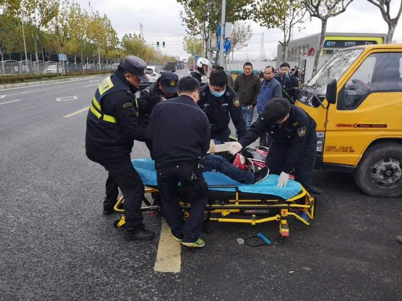 當(dāng)日10:30,當(dāng)宗保隊(duì)員陳友明和黎小江巡邏至地鐵金海路站,突然聽到一身巨響,回頭一看,是在老陳王廟路口,一輛貨車與電瓶車相撞,發(fā)生了交通事故。兩名隊(duì)員立即奔過去,控制并保護(hù)現(xiàn)場(chǎng),對(duì)現(xiàn)場(chǎng)情況進(jìn)行勘查,并把事故立即上報(bào)給當(dāng)日值班領(lǐng)導(dǎo)。隊(duì)員了解情況后,讓貨車司機(jī)拔打110報(bào)警,隊(duì)員陳友明馬上打了急救電話120。路口來往車輛較多,兩名隊(duì)員立馬指揮來往車輛,以防造成擁堵導(dǎo)致救護(hù)車無法正常駛?cè)搿k娖寇囍魇軅麌?yán)重,救護(hù)車一到,隊(duì)員馬上協(xié)助救護(hù)人員一起把傷者抬上救護(hù)車,讓醫(yī)護(hù)人員將傷者送往醫(yī)院救治。