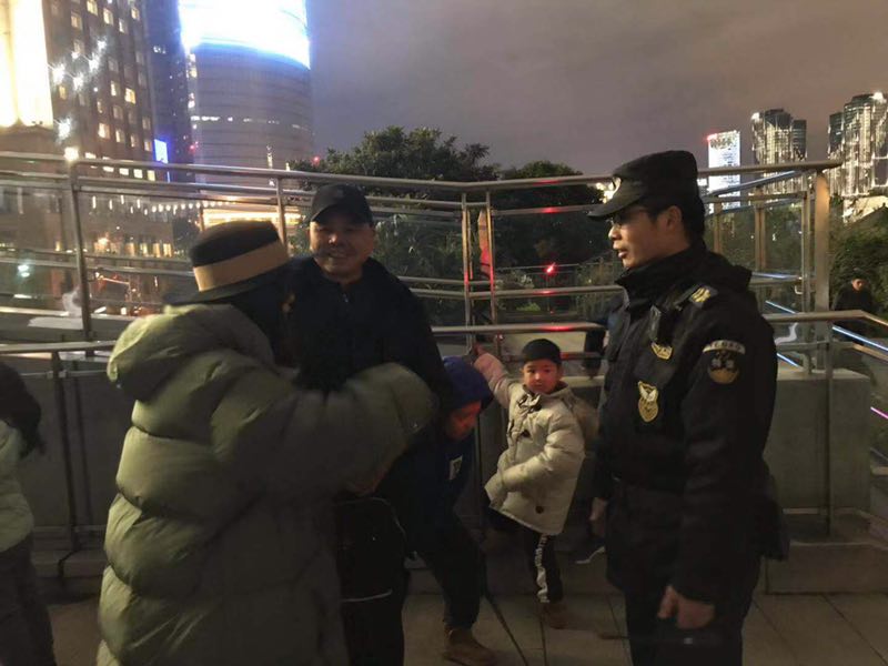 2018年12月31日晚20時25分,正在濱江區(qū)域安排大客流管控設(shè)卡工作的特保隊長余澤權(quán)接到當天值班所長夏志松的協(xié)查指令,說濱江哈根達斯附近有增援民警求助,現(xiàn)場有游客家屬走丟,要求我們趕到現(xiàn)場處置。接到這一指令后,余澤權(quán)帶領(lǐng)濱江段執(zhí)勤班長王曉盼與隊員張雅坤趕赴現(xiàn)場,找到當事人后通過了解,當事人一家在濱江親水平臺處與其父親走散,電話聯(lián)系不通,而且都是第一次來到小陸家嘴區(qū)域游玩,對地方不熟悉。