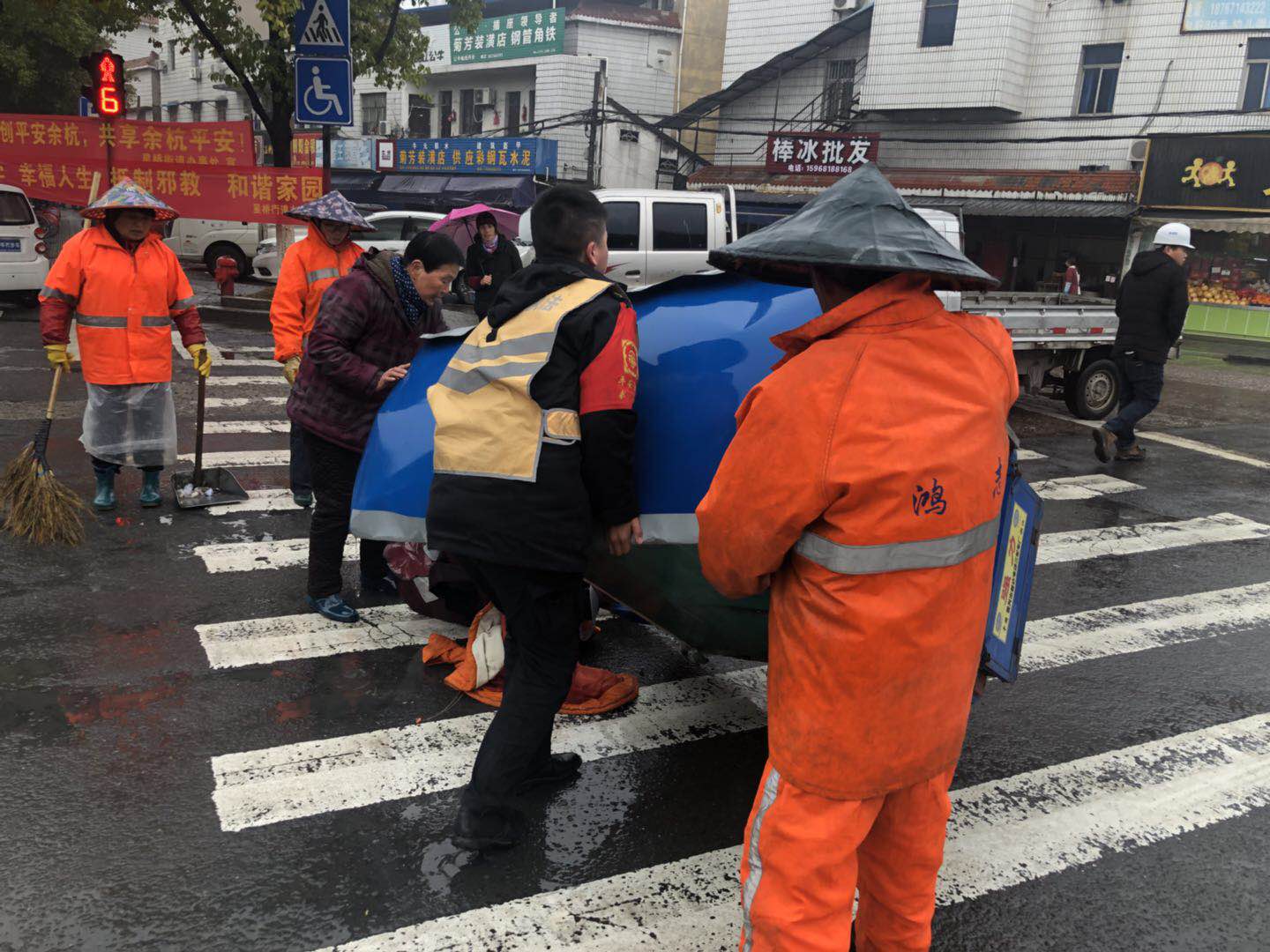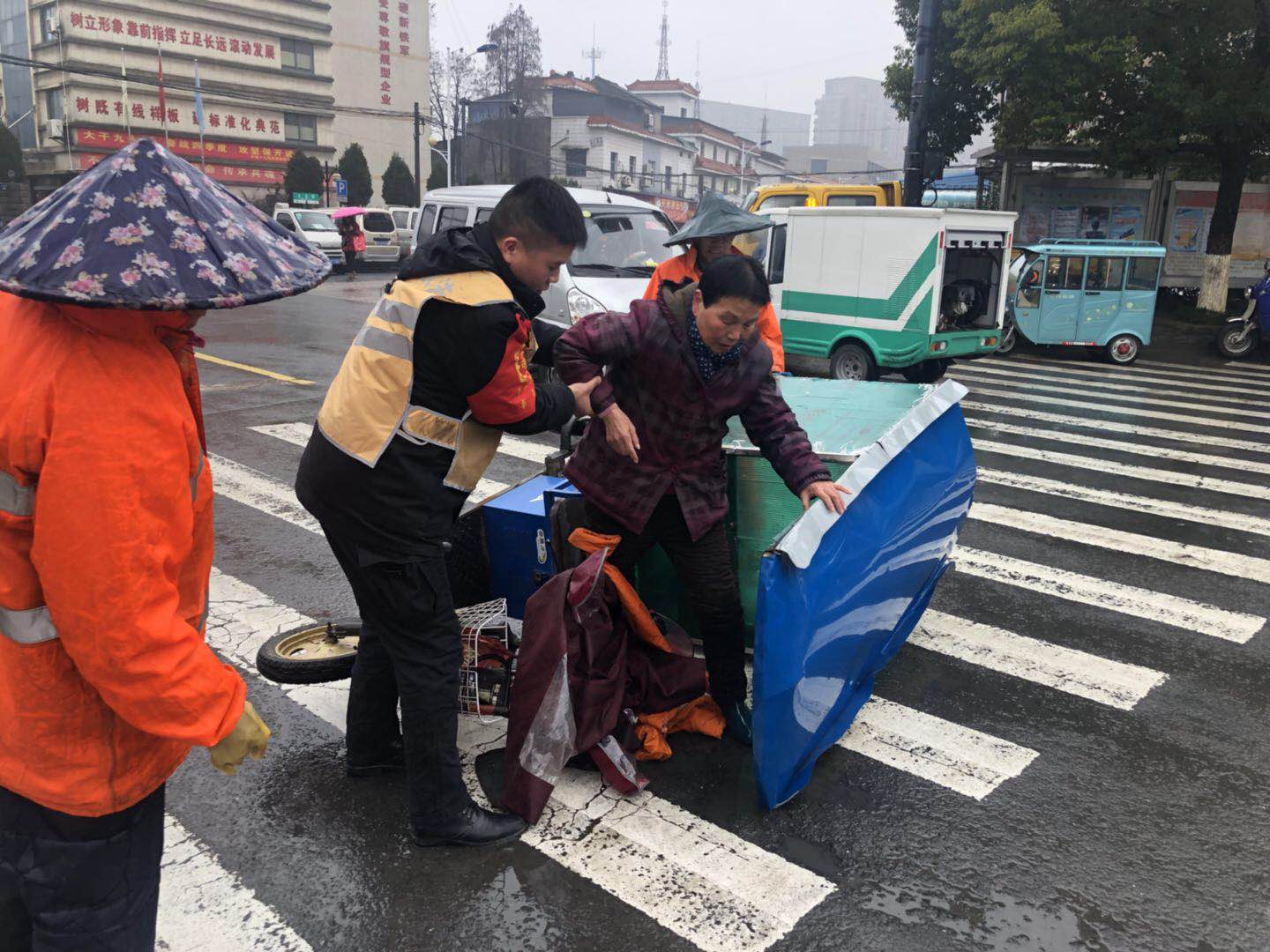 2019年1月15日上午9點(diǎn)30分左右,浙江民泰駐星橋市容項(xiàng)目隊(duì)長陳佳寶和隊(duì)員孫慧洋在藕花洲大街巡查時(shí),發(fā)現(xiàn)一名老婆婆由于雨天路滑,電瓶車側(cè)翻壓在身上,無法動(dòng)彈躺在路上,無人幫忙。
