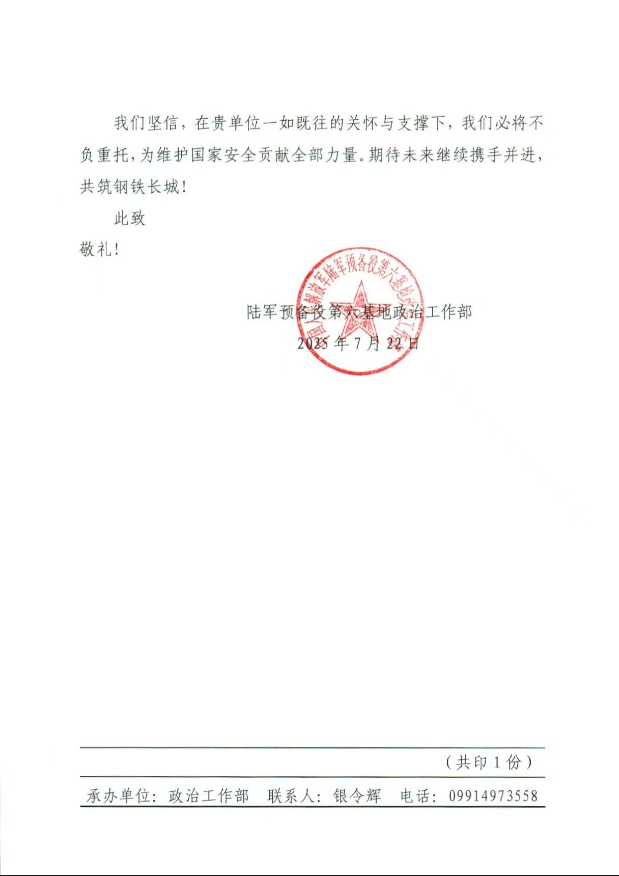 1宗保公司收到陸軍預(yù)備役第六基地政治工作部的感謝信