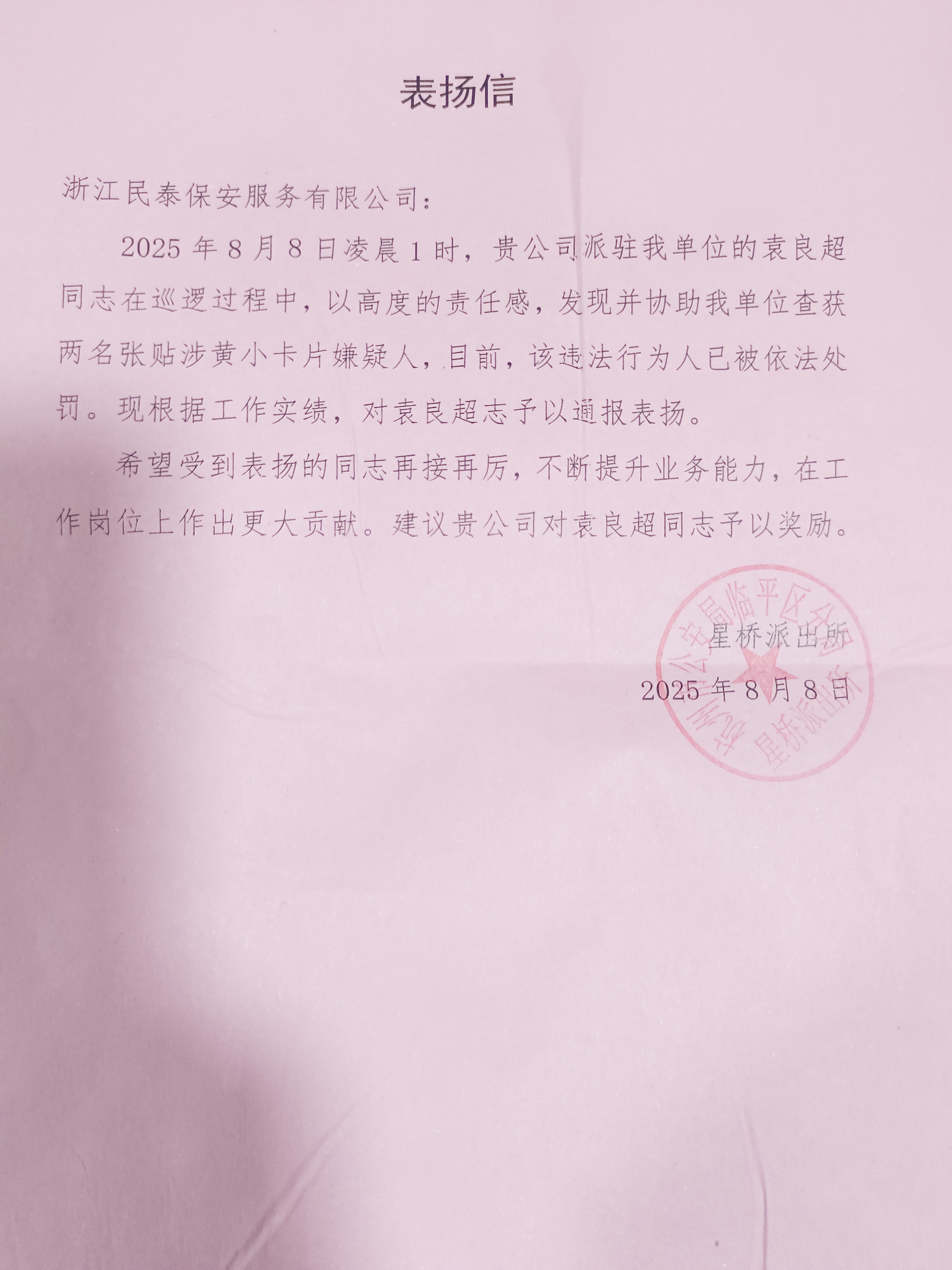 8月8日,民泰公司收到杭州市公安局臨平區(qū)分局星橋派出所的表揚(yáng)信,信中贊揚(yáng)公司員工袁良超認(rèn)真負(fù)責(zé)、擔(dān)當(dāng)善為的優(yōu)良作風(fēng),表揚(yáng)他在全力協(xié)助派出所維護(hù)社會(huì)秩序工作中的突出表現(xiàn)。