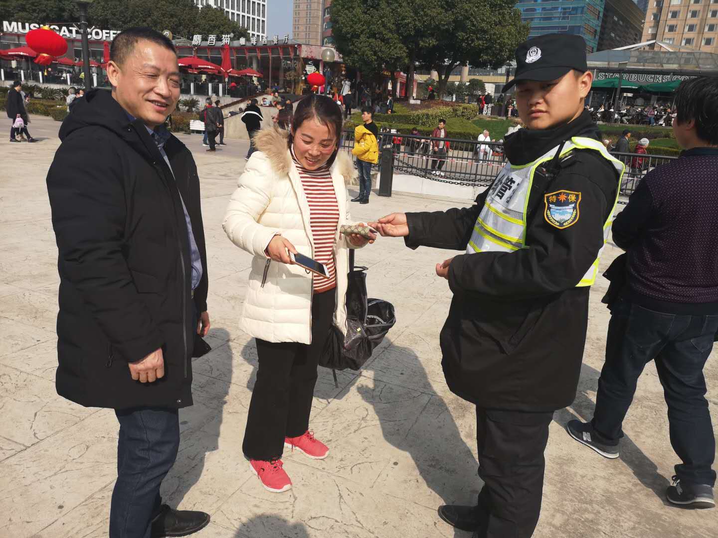 2月6日,宗保特保隊員王曉盼與張雅坤在濱江公園花園石橋路段巡邏時碰到游客求助,說他在自動售賣機處撿到一部VIVO手機,需要交于我們處理,幫忙找到失主。接到這一情況后,兩名隊員及時匯報,根據(jù)現(xiàn)場值班隊長指令,通過手機來電主動聯(lián)系失主,約定招領地點,與失主見面后核實其信息無誤后將手機交還失主。