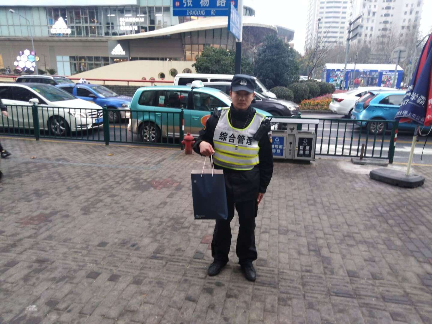 2月4日,宗保特保隊員張洪偉在張楊路沿線,對違停非機動車進行搬離處理時,發(fā)現(xiàn)一輛違停共享單車車筐內(nèi)有手提袋一只,該隊員撿到該手提袋后并沒有私自打開檢查,而是及時上報,在班組長到達現(xiàn)場后開啟執(zhí)法記錄儀才共同檢查該手提袋。通過檢查,該手提袋內(nèi)裝有新衣服2件、現(xiàn)金500余元,在等待現(xiàn)場無果后,兩人一起將該手提袋交至綜合執(zhí)法隊第三中隊值班領導手中。