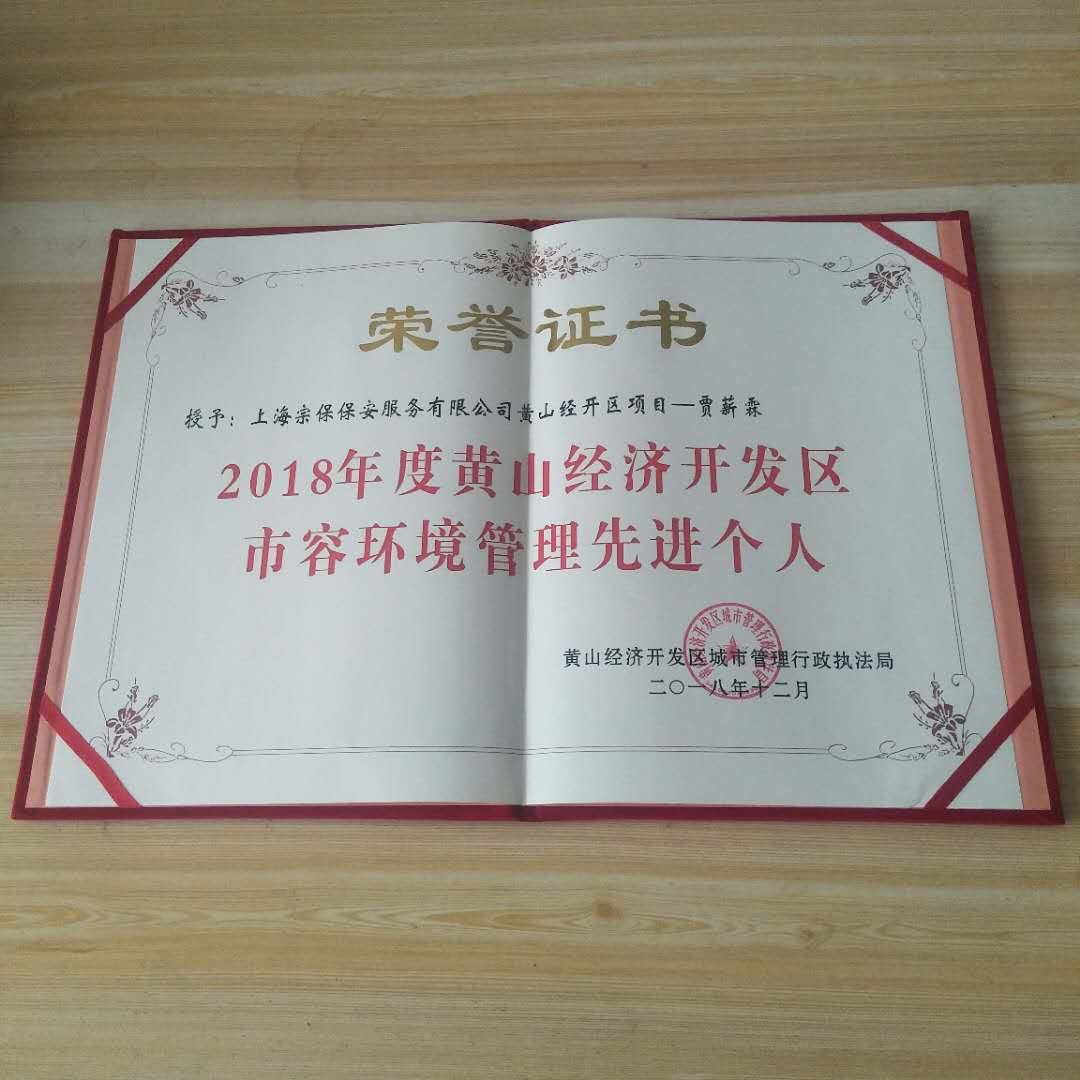 2019年2月2日,黃山經(jīng)濟(jì)開(kāi)發(fā)區(qū)城市管理行政執(zhí)法局劉局長(zhǎng),為上海宗保頒發(fā)“2018年度黃山經(jīng)濟(jì)開(kāi)發(fā)區(qū)市容環(huán)境管理先進(jìn)企業(yè)”及“2018年度黃山經(jīng)濟(jì)開(kāi)發(fā)區(qū)市容管理先進(jìn)個(gè)人”榮譽(yù)證書