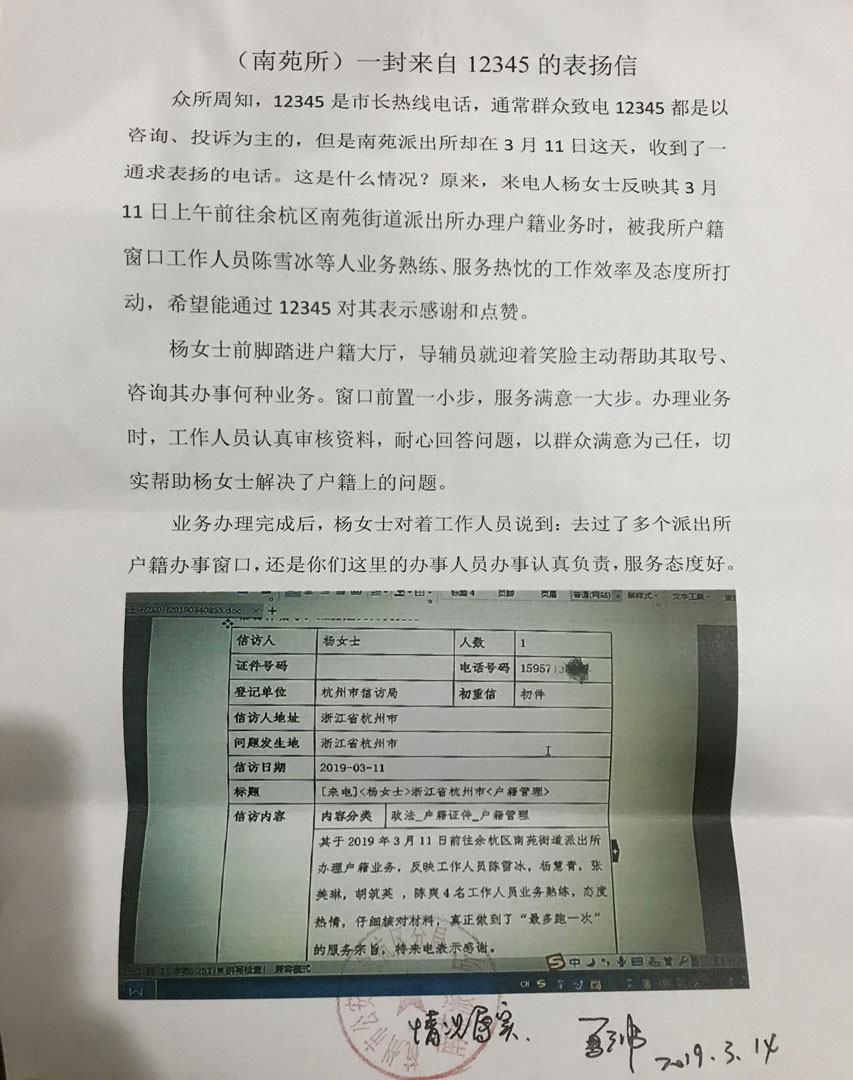 2019年3月14日,浙江民泰南苑輔警項目收到一封來自12345專線的表揚信,對余杭南苑街道派出所工作人員及宗保戶籍室隊員陳爽工作認真、業(yè)務熟練、貼心服務表示感謝。