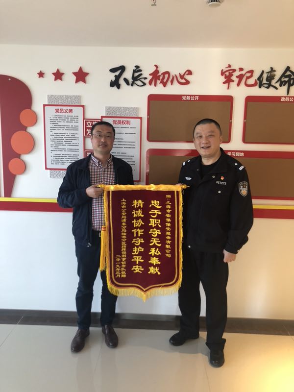 2019年3月19日,浦東公安分局臨港分區(qū)指揮中心刑事偵查隊指導(dǎo)員俞浩,將一面繡有“忠于職守,無私奉獻,精誠協(xié)作,守護平安”的錦旗送到宗保公司副總經(jīng)理蔣德玉手中。