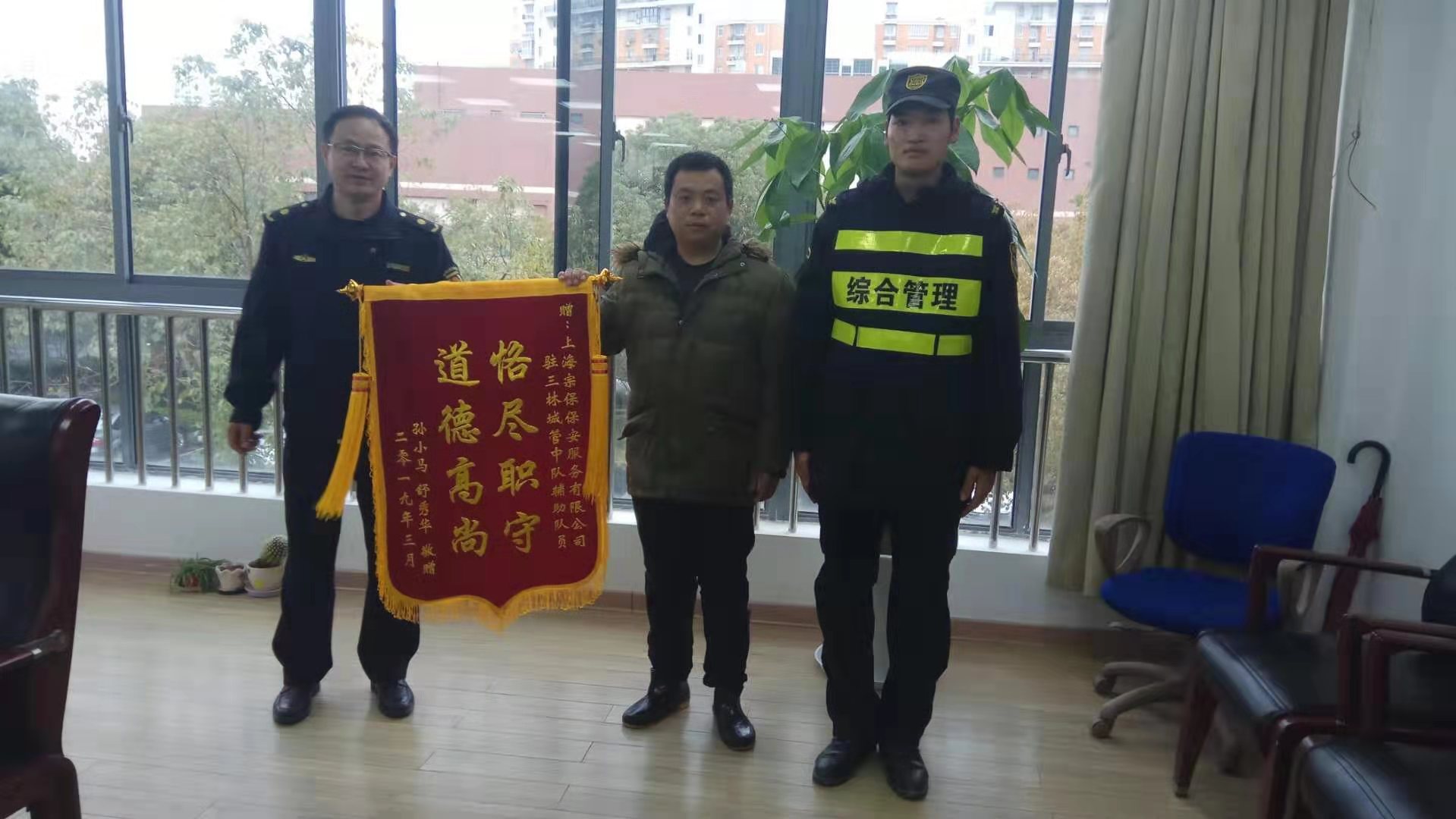 2019年3月18日下午,市民孫先生將一面繡著“恪盡職守,道德高尚”的錦旗送到了三林城管隊(duì),感謝宗保特保隊(duì)員幫他找回孩子。