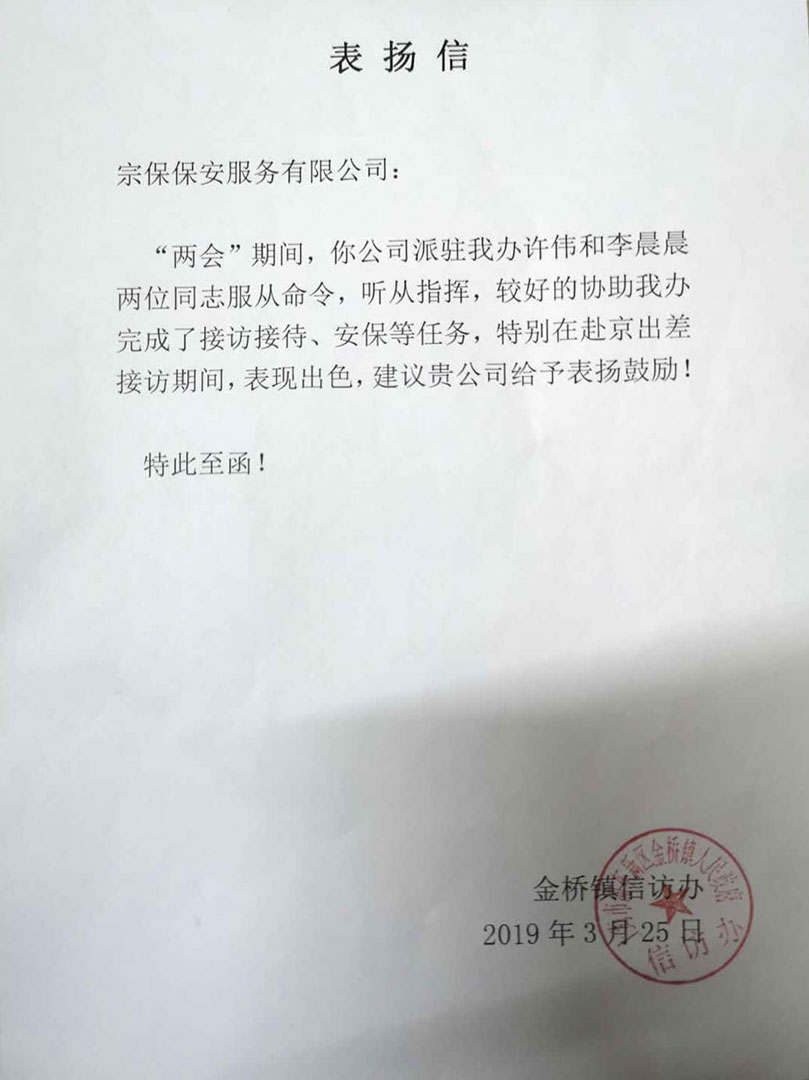 2019年3月25日,宗保駐金橋輔警項目收到一封來自金橋鎮(zhèn)人民政府信訪辦的表揚信。
