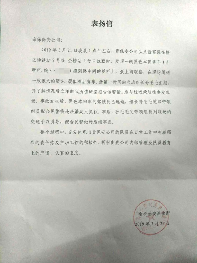 2019年3月26日,宗保駐金橋輔警項目收到一封來自金橋治安派出所的表揚信,信件是對該項目隊員工作的認(rèn)可及贊揚。