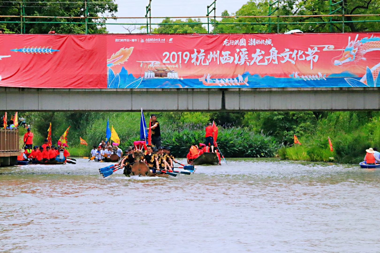 (供稿人:王鳳樓)2019年6月7日,2019杭州西溪龍舟文化節(jié)盛大開幕。盛裝的龍舟在杭州西溪濕地洪園浜口橋的水域來來回回穿梭表演,精壯的漢子奮勇爭先,各條龍舟相互展開比試,槳手們鉚足了勁,頂著急浪猛劃,激起了簇簇浪花。