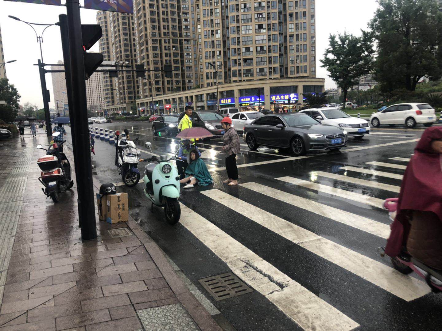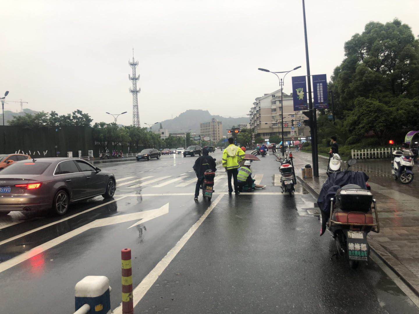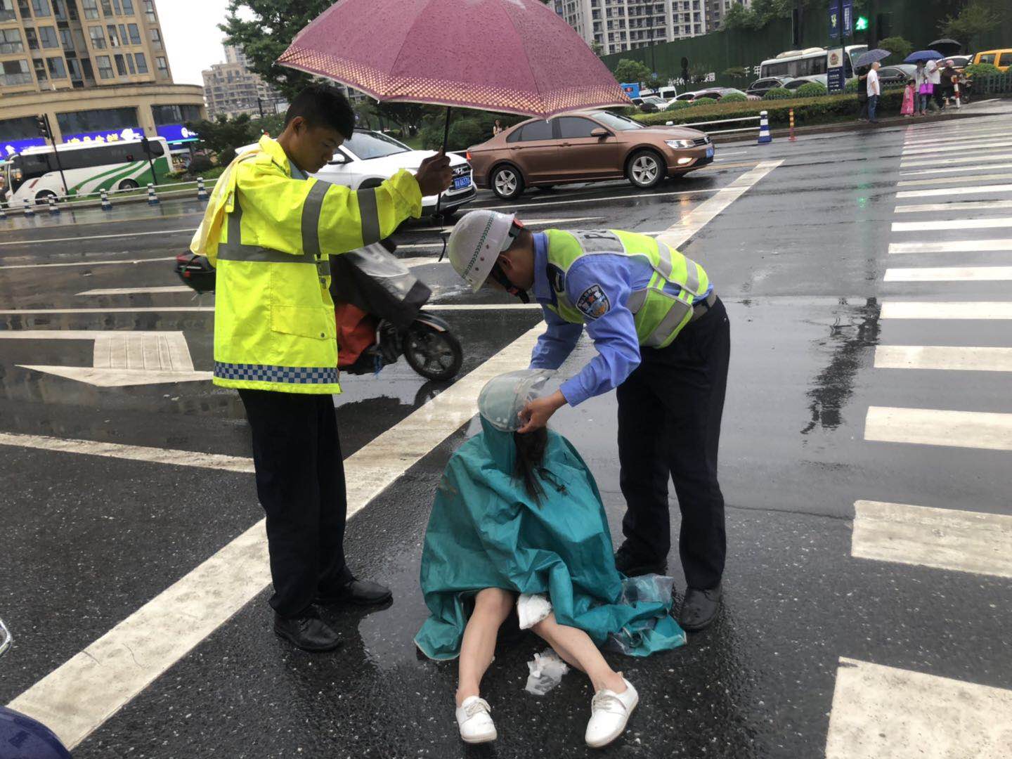 當(dāng)日17:40左右,隊員李丹、李寶玉和王春陽在閑興路永樂商務(wù)酒店附近巡邏,發(fā)現(xiàn)在不遠處非機動車道上發(fā)生兩電動車事故,一方逃逸,一方受傷倒地。看到此情況后,隊員第一時間上前維護現(xiàn)場報警并上報當(dāng)日值班。在接到中隊指令現(xiàn)場取證完畢后,詢問得知傷者傷勢不是很嚴重,隨后護送傷者到閑林衛(wèi)生院進行醫(yī)治。