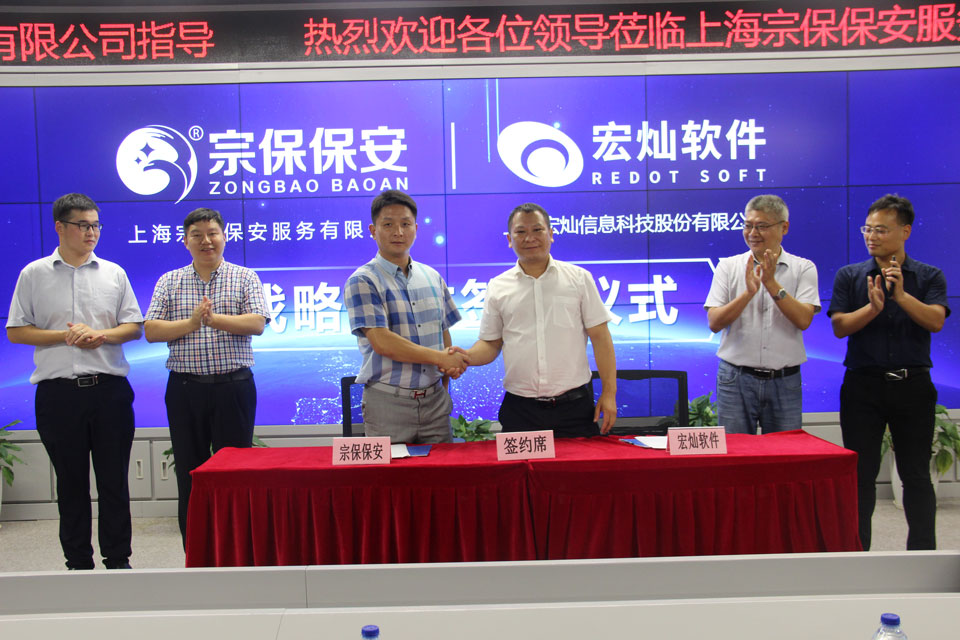 2019年8月14日,上海宏燦信息科技股份有限公司與上海宗保保安服務(wù)有限公司戰(zhàn)略合作簽約儀式在公司訓(xùn)練基地隆重舉行。宏燦股份董事長胡李宏、副總經(jīng)理李小小、項目總工程師孫海明,宗保保安董事長馮中保、宗保科技總經(jīng)理楊璞等人出席簽約儀式。