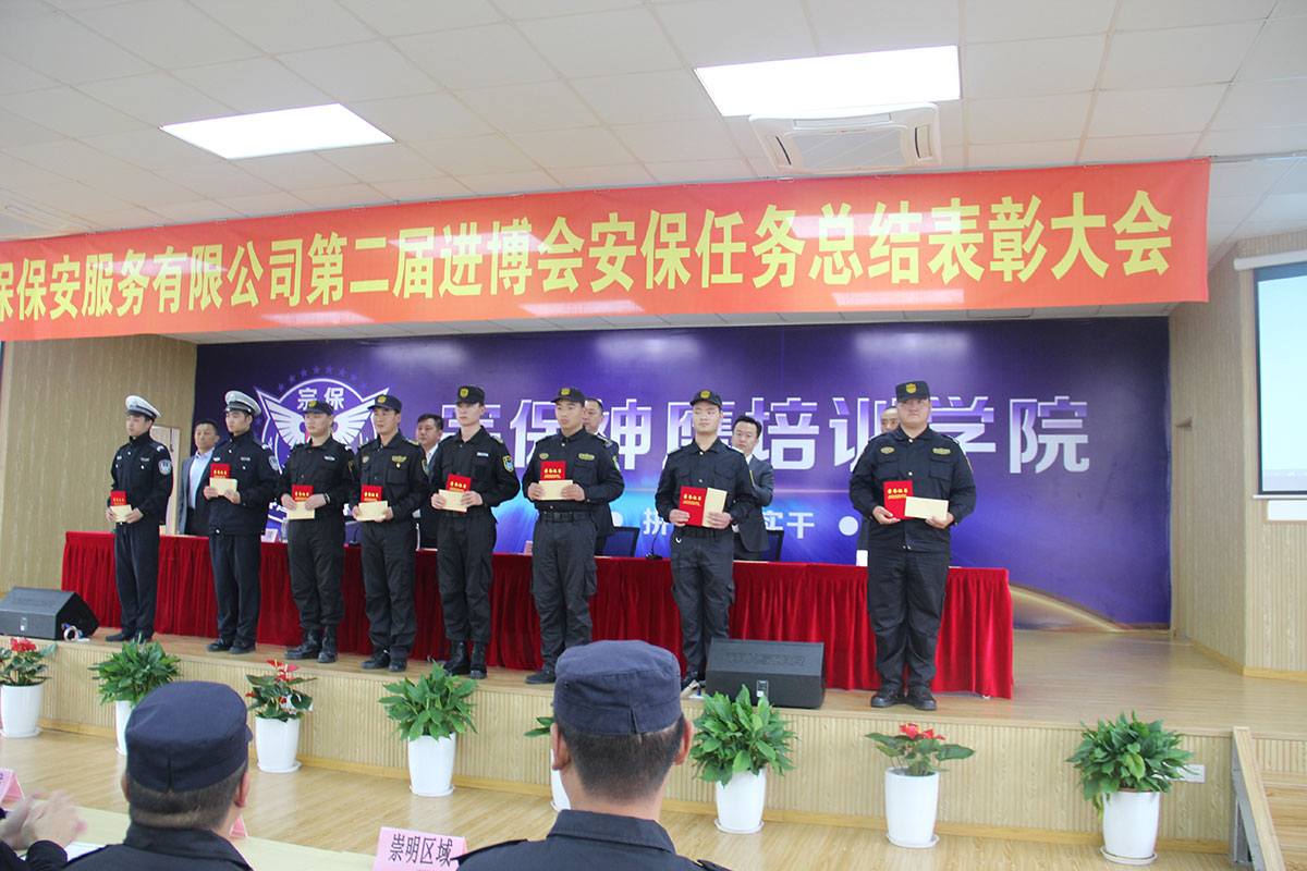 11月23日上午,上海宗保保安服務有限公司在訓練基地禮堂隆重召開“第二屆中國國際進口博覽會”安保工作總結(jié)表彰大會,公司領(lǐng)導、區(qū)域經(jīng)理、項目負責人以及受到表彰的優(yōu)秀個人共140余人參加會議。