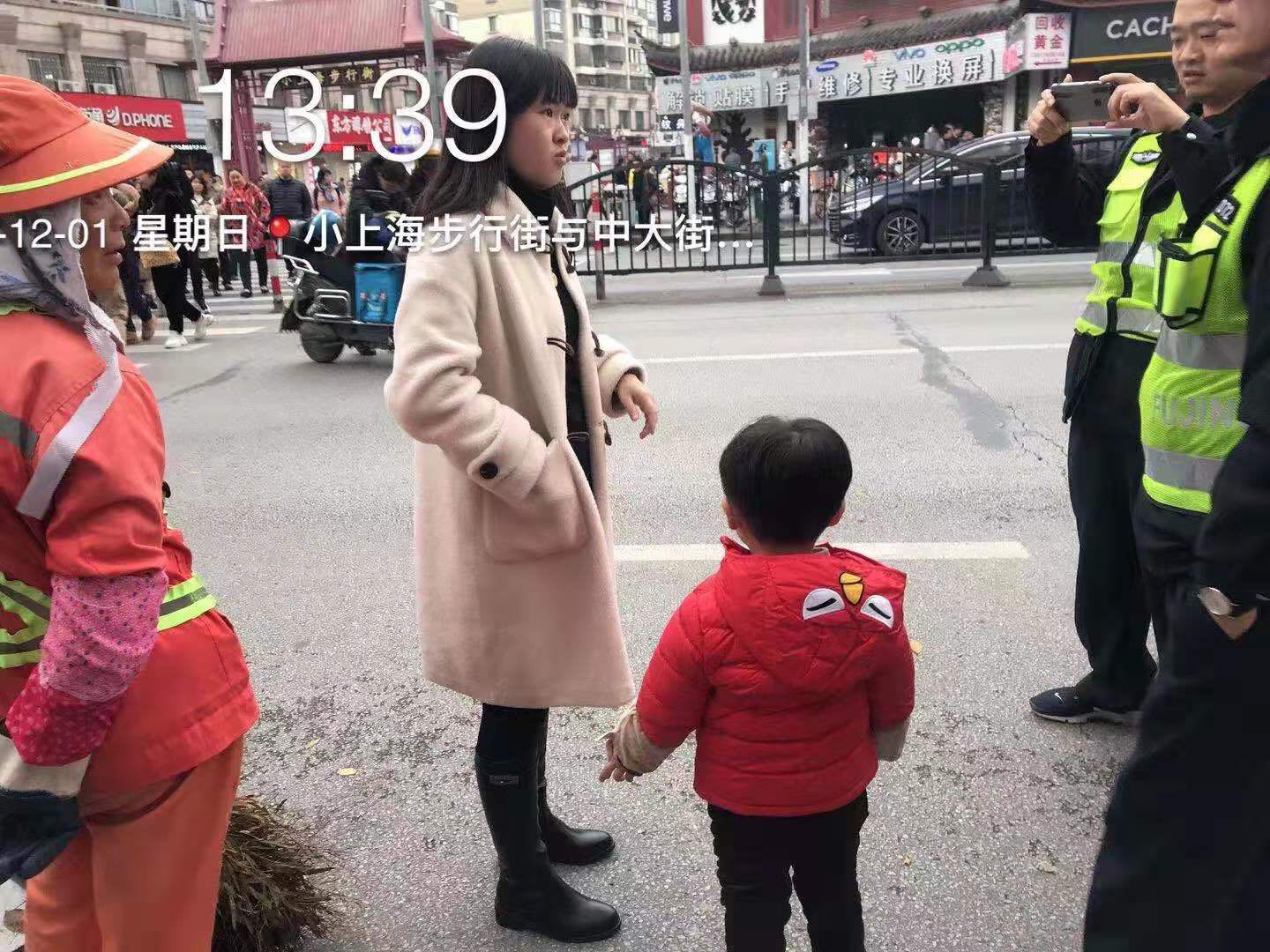 12月1日,周浦輔警隊(duì)員王云強(qiáng)13:22分巡邏至步行街121號正新雞排店門口時,發(fā)現(xiàn)一個小男孩一直在哭泣,旁邊沒有家長看護(hù)。于是,就上前詢問,得知小男孩和媽媽一起出來逛街,自己只顧玩,走著走著就找不到媽媽了,所以急得哭了起來。