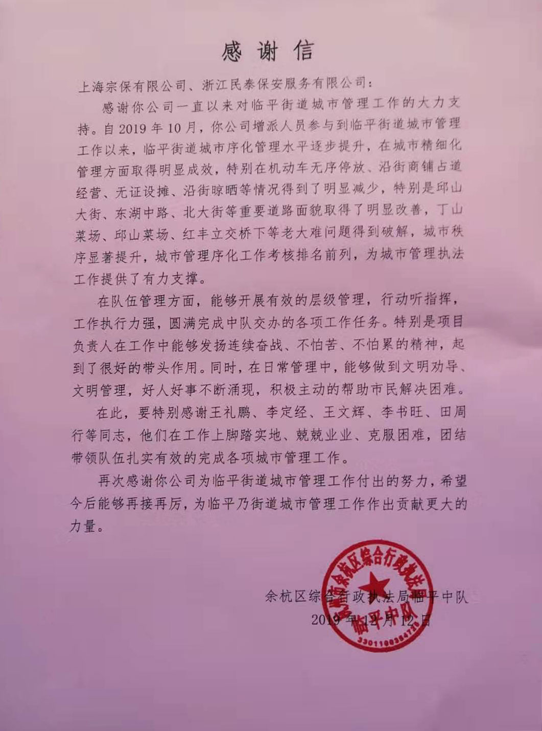 12月12日,臨平城管中隊(duì)送來(lái)表?yè)P(yáng)信,對(duì)浙江民泰駐該所項(xiàng)目的特保隊(duì)進(jìn)行表?yè)P(yáng)。