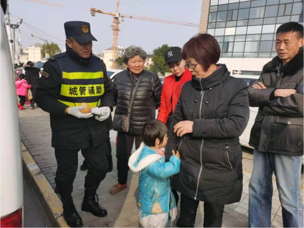 此時,宗保公司駐周浦城管項目輔助人員王安斌在周市路關岳路的鎮(zhèn)黨建中心門口見到了這個驚慌失措的小姑娘。據(jù)王安斌回憶說,當時正好是下午三時左右,黨建中心門口有一名四歲左右的女童獨自在馬路邊哭泣。王安斌見狀立即停止巡查,上前詢問情況。原來,這個小姑娘和家里人走失了,說不清楚家庭地址和家人電話。王安斌立即將此情況上報,并告知附近2公里的隊員注意街面巡查時有無尋找孩子的人員。半個小時后消息傳來,周市路中大街附近,有個女子神色慌張,不停地在打電話聯(lián)系。隊員立即通知王安斌帶孩子前來。終于,走失的孩子找到了外婆,大人孩子破涕為笑。老夫妻對王安斌急群眾所急的善舉不停地表示謝意,并要買來香煙作為感謝。王安斌婉言謝絕,用他的話說:我只是做了我應該做的,我雖然不是正式隊員,但我身上穿的衣服印有“城市管理”,我也有責任做好身邊的每一件事。