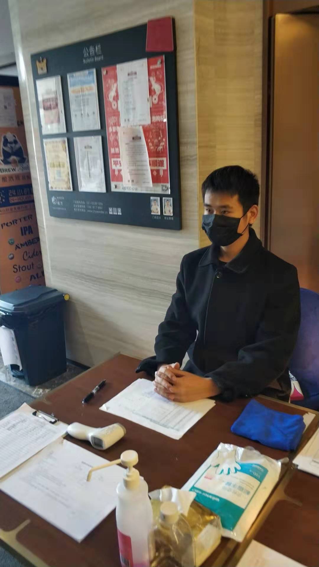 疫情防控中,孫超與隊(duì)友一起每天負(fù)責(zé)大廈公共區(qū)域消毒、保持樓道通風(fēng)、檢測進(jìn)入大廈人員體溫、登記外地來滬人員信息、宣傳疫情防護(hù)知識。