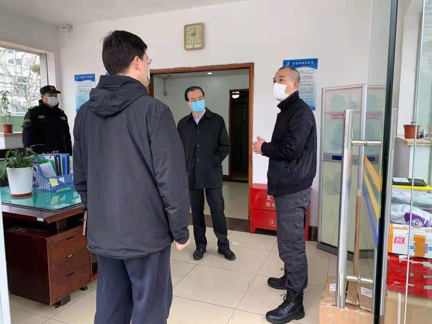 2月13日,上海市委黨校副校長朱高亮、后勤保衛(wèi)處副處長高華檢查指導疫情防控工作,看望慰問疫情防控一線的宗保員工。