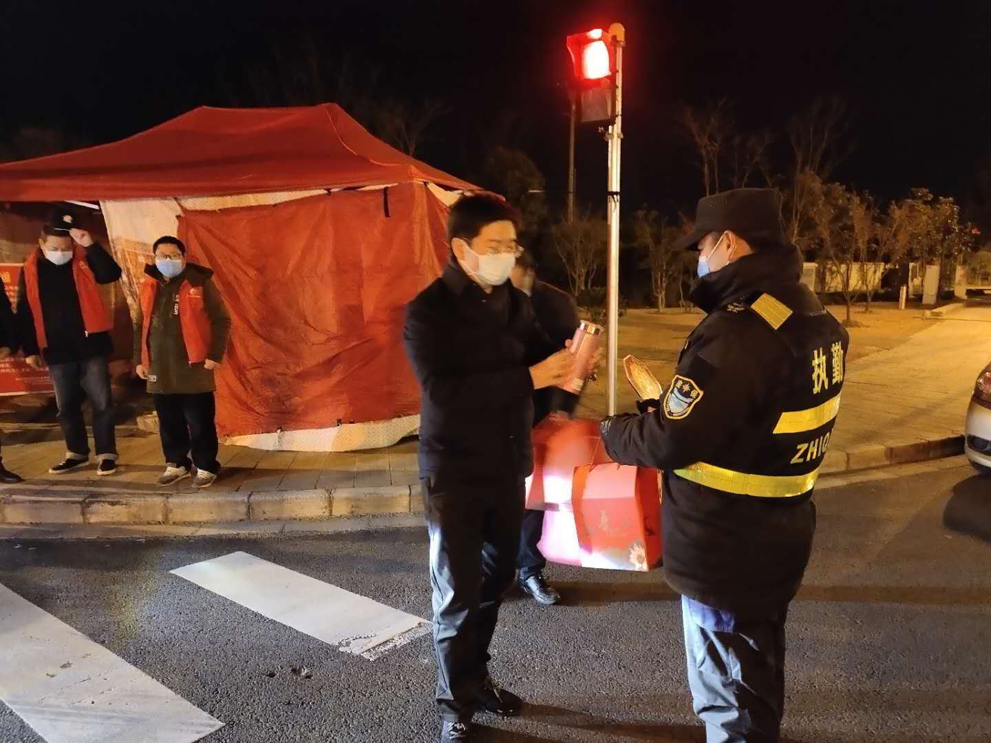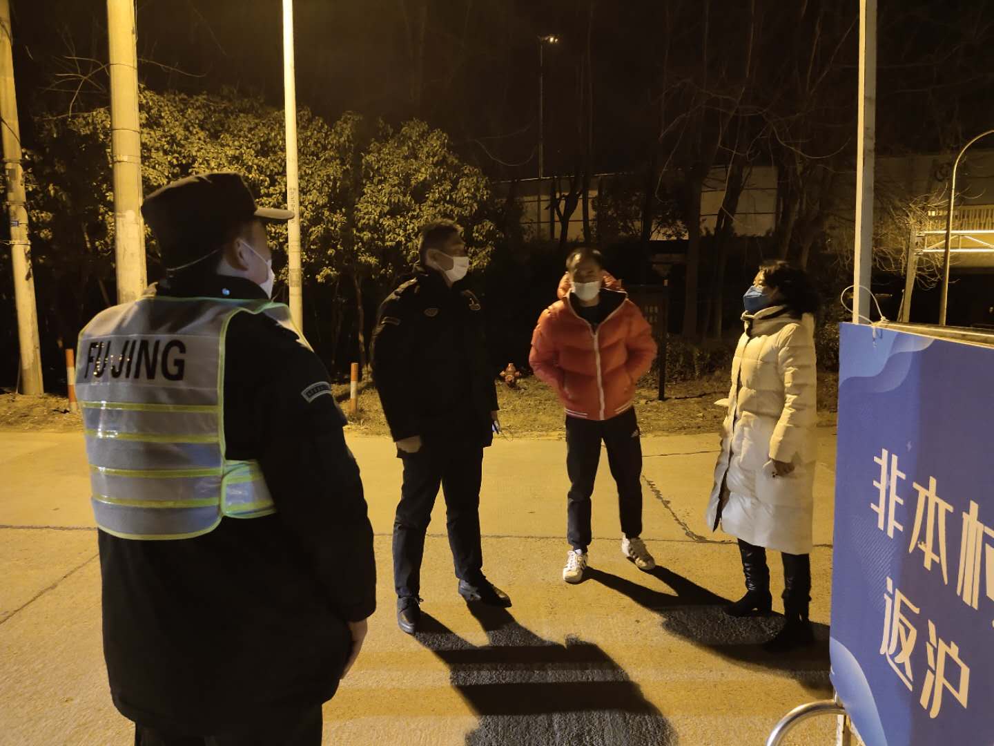 2月17日晚,張江鎮(zhèn)政法書記潘艷萍現(xiàn)場檢查指導疫情防控工作,看望慰問疫情防控一線的宗保員工。