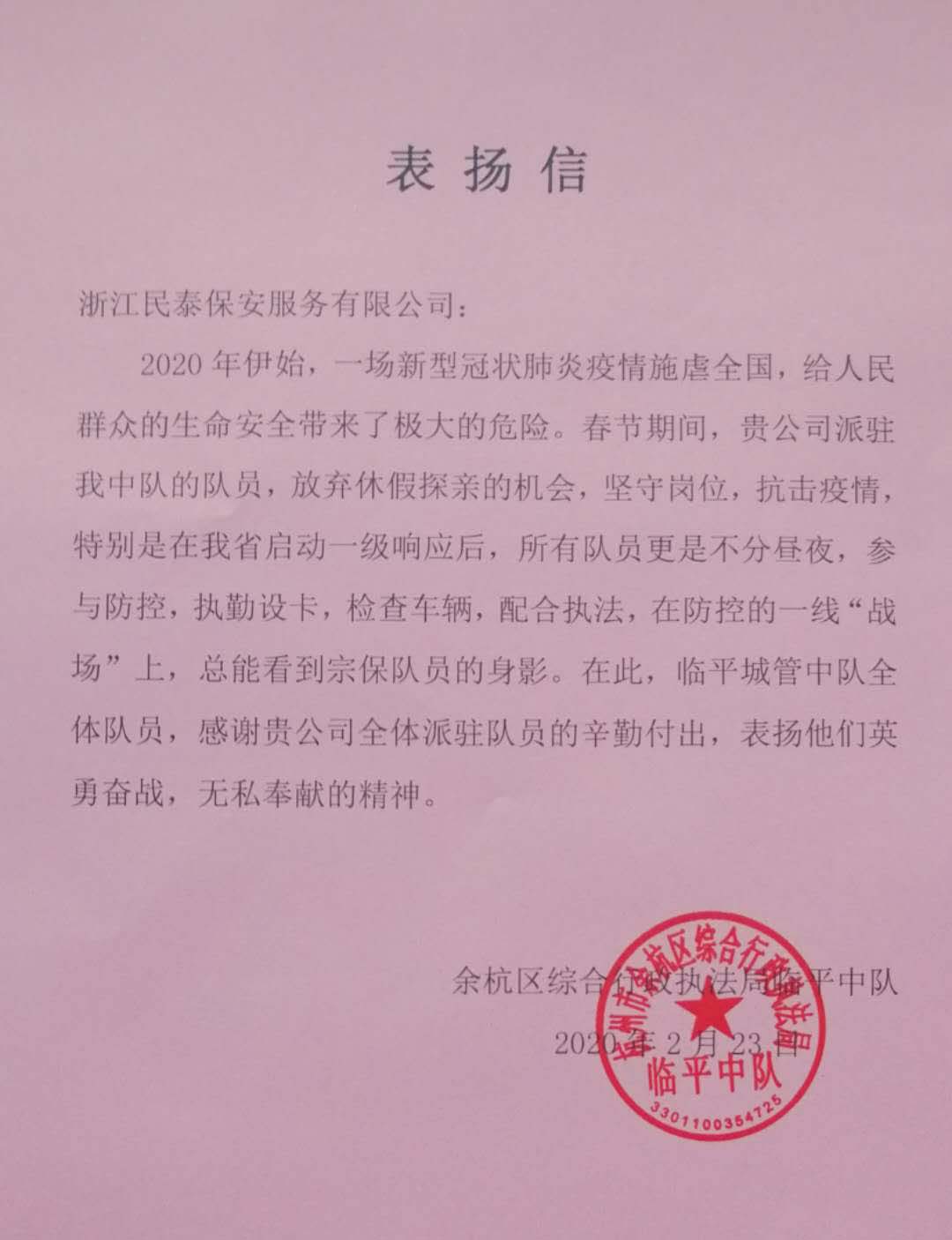 2月23日,浙江民泰公司收到一封杭州市余杭區(qū)臨平城管中隊(duì)送來的表揚(yáng)信。信中,贊揚(yáng)了公司駐該城管中隊(duì)項(xiàng)目隊(duì)員在疫情防控中的工作表現(xiàn),感謝隊(duì)員們的辛勤付出。