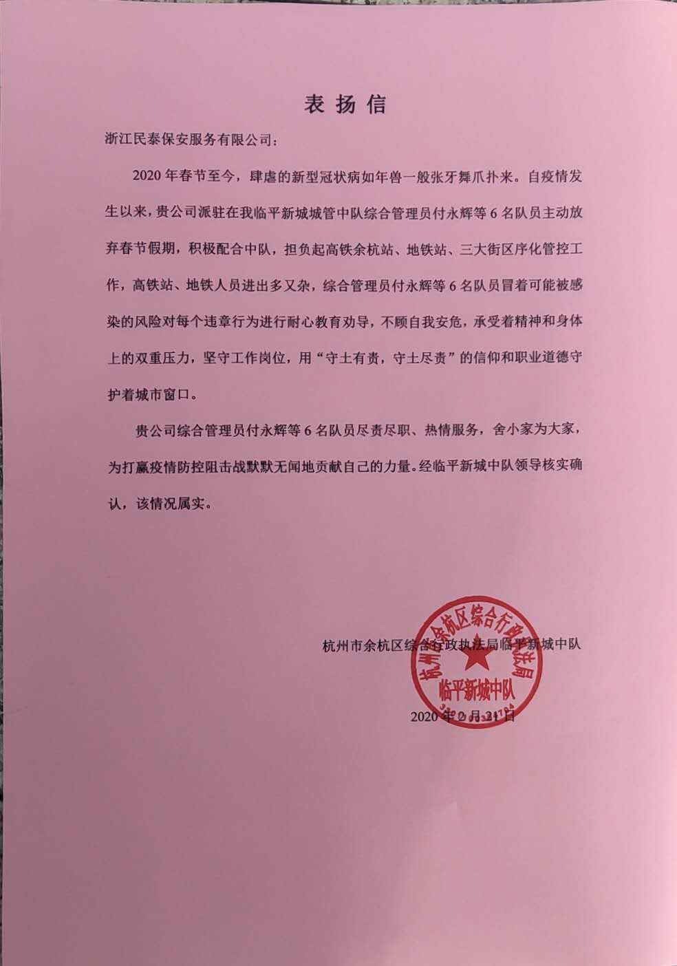 2月21日,杭州市余杭區(qū)臨平城管中隊(duì)送來表揚(yáng)信,表揚(yáng)浙江民泰公司駐該中隊(duì)項(xiàng)目付永輝等六名隊(duì)員在疫情防控中的工作表現(xiàn)。