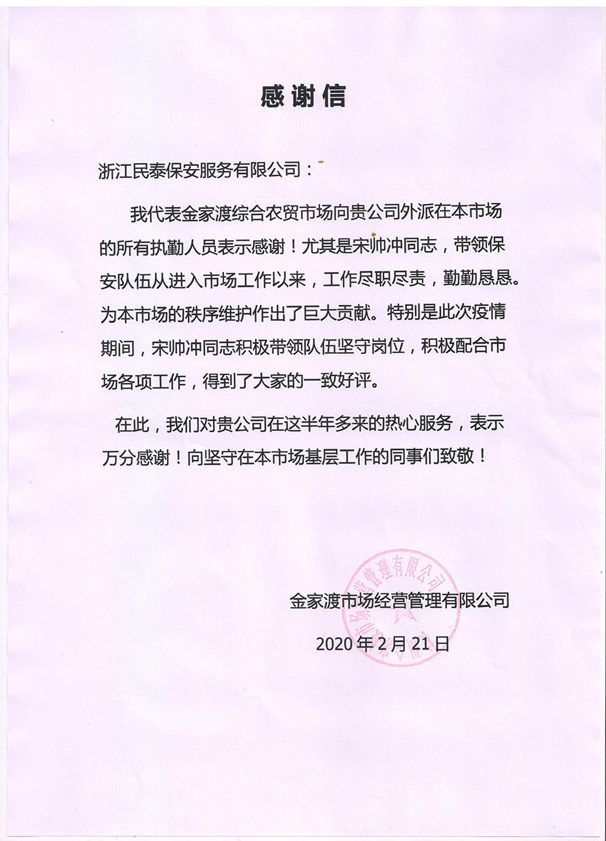 2月21日,金家渡市場經(jīng)營管理有限公司送來感謝信,對浙江民泰派駐該市場的所有特保隊(duì)員,特別是負(fù)責(zé)人宋帥沖在疫情防控中的工作表現(xiàn)進(jìn)行表揚(yáng)。