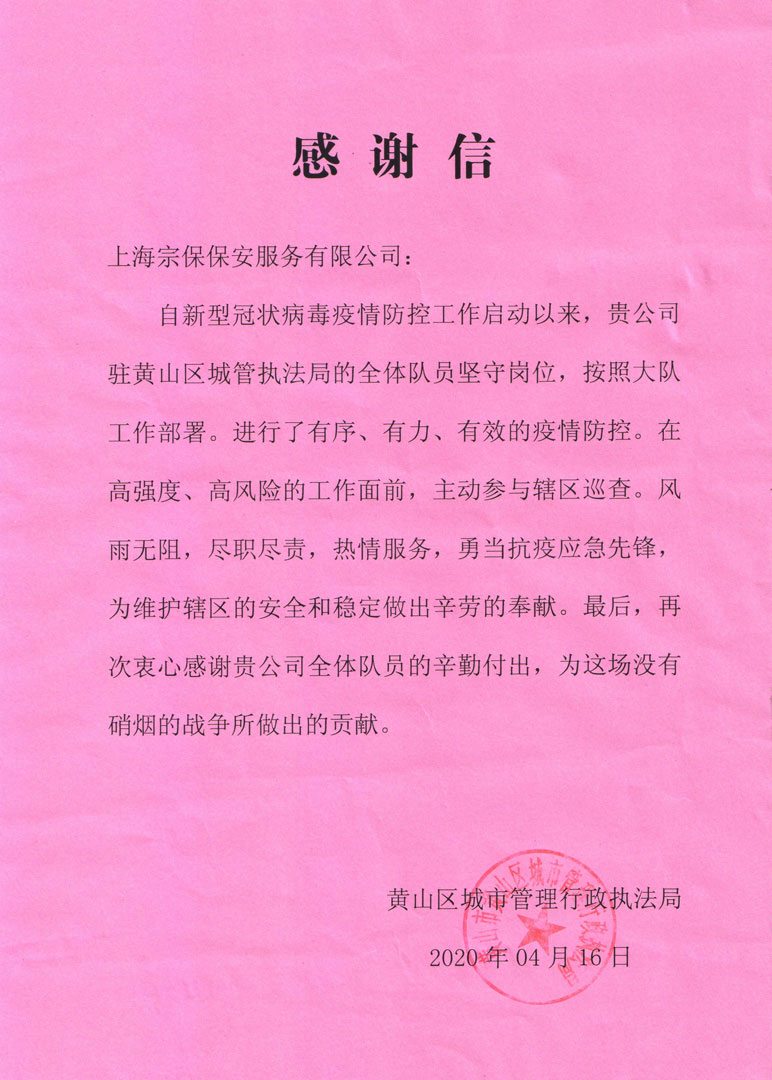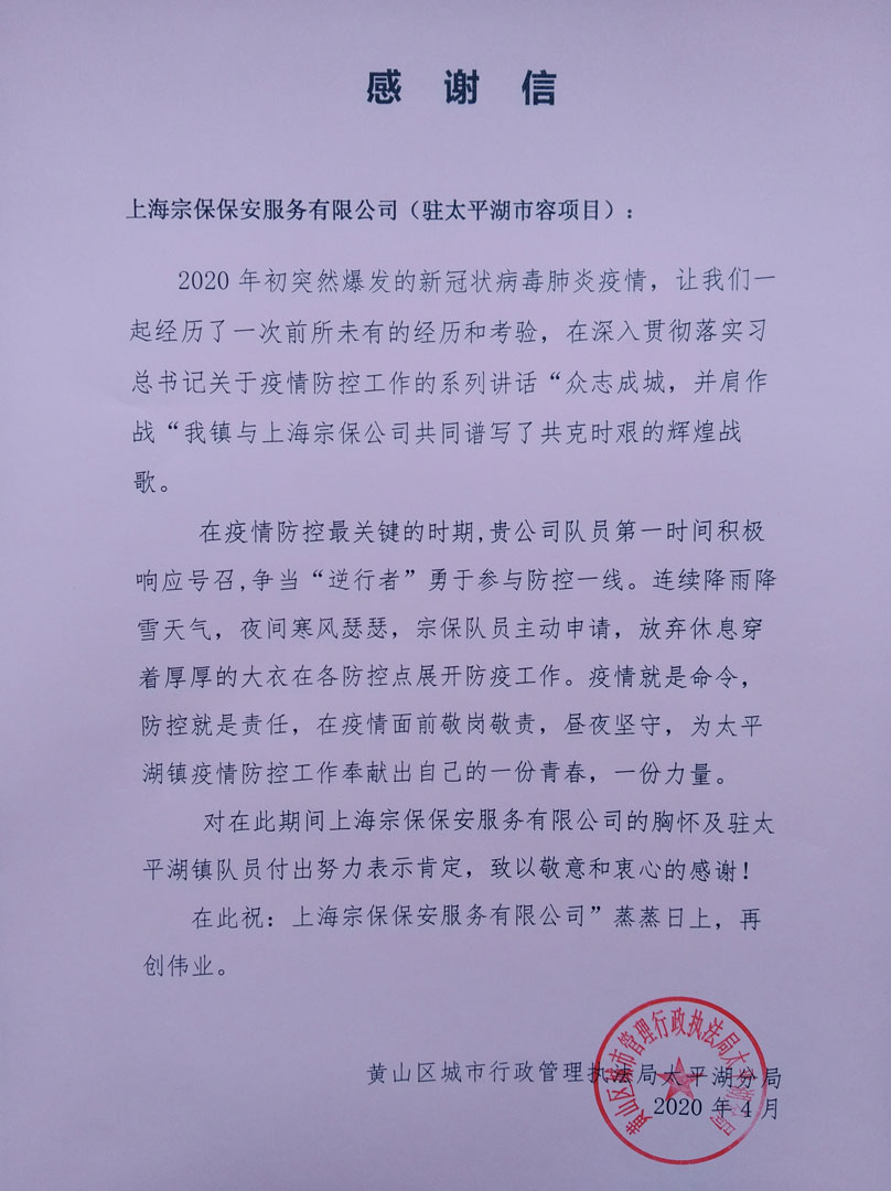 4月16日,宗保公司收到黃山區(qū)城市管理行政執(zhí)法局的一封感謝信,對在疫情防控期間付出辛勞的宗保隊員們表示肯定和感謝。