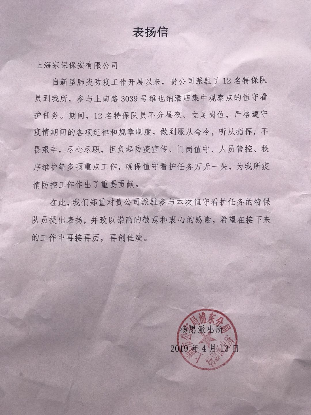 4月13日,宗保公司駐三林鎮(zhèn)市容項目收到楊思派出所送來的一封表揚(yáng)信,信中對三林鎮(zhèn)市容項目參與XX酒店集中醫(yī)學(xué)觀察點值守看護(hù)任務(wù)的宗保隊員提出表揚(yáng)和感謝。