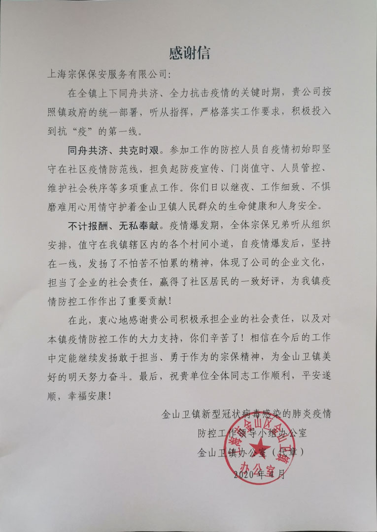 4月21日,宗保公司駐金山衛(wèi)鎮(zhèn)市容項目收到金山衛(wèi)鎮(zhèn)新冠疫情防控工作領(lǐng)導(dǎo)小組辦公室和金山衛(wèi)鎮(zhèn)辦公室聯(lián)合發(fā)來的一封感謝信,對在疫情防控期間付出辛勞的宗保隊員們表示肯定和感謝。