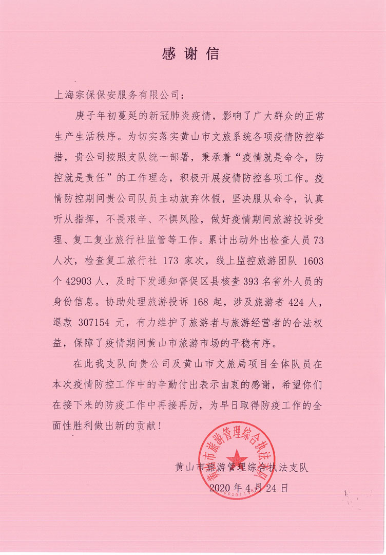 疫情發(fā)生后,宗保人主動(dòng)作為,配合各級(jí)政府落實(shí)各項(xiàng)疫情防控措施,積極做好春節(jié)期間勸離寺廟(庵)香客,保障居家隔離、集中隔離點(diǎn)隔離,查處活禽出售,核查餐飲店關(guān)閉情況,盤查車輛,排查疫區(qū)來(lái)滬人員,接送隔離人員,檢查娛樂(lè)場(chǎng)所、人員密集場(chǎng)所等落實(shí)關(guān)閉要求情況,檢測(cè)進(jìn)菜場(chǎng)人員體溫,排查賓館、出租房等內(nèi)的疫區(qū)來(lái)滬人員,維護(hù)機(jī)場(chǎng)航站樓秩序,排查從疫區(qū)來(lái)滬的高鐵旅客,宣傳疫情防控知識(shí),維護(hù)藥房門口排隊(duì)秩序,保障居民購(gòu)買防護(hù)用品登記,進(jìn)行疫情防控志愿活動(dòng)等17類疫情防控輔助工作。