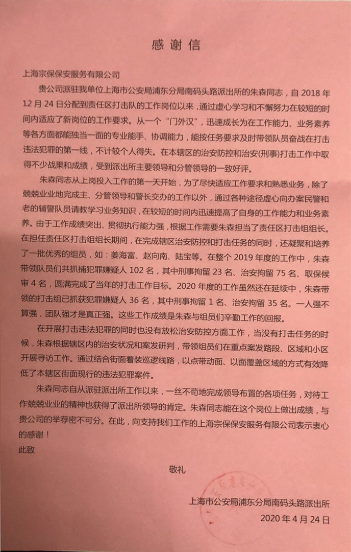 截至4月30日,宗保公司參與疫情防控共出動(dòng)人員43.3萬(wàn)多人次,在19座寺廟(庵)勸離香客,49處路口設(shè)卡,6個(gè)地鐵站口檢測(cè)進(jìn)出地鐵站人員體溫,3個(gè)高鐵站檢測(cè)出站旅客體溫,浦東、虹橋2個(gè)機(jī)場(chǎng)4個(gè)候機(jī)樓秩序維護(hù),146個(gè)小區(qū)門口檢測(cè)進(jìn)入小區(qū)人員體溫,76個(gè)集中隔離點(diǎn)值班守護(hù),930多人次接送隔離人員,214戶居家隔離保障,121個(gè)藥店秩序維持,配合查處活禽交易236起,盤查人員83.8萬(wàn)多人次、盤查車輛21.8萬(wàn)多車次。
