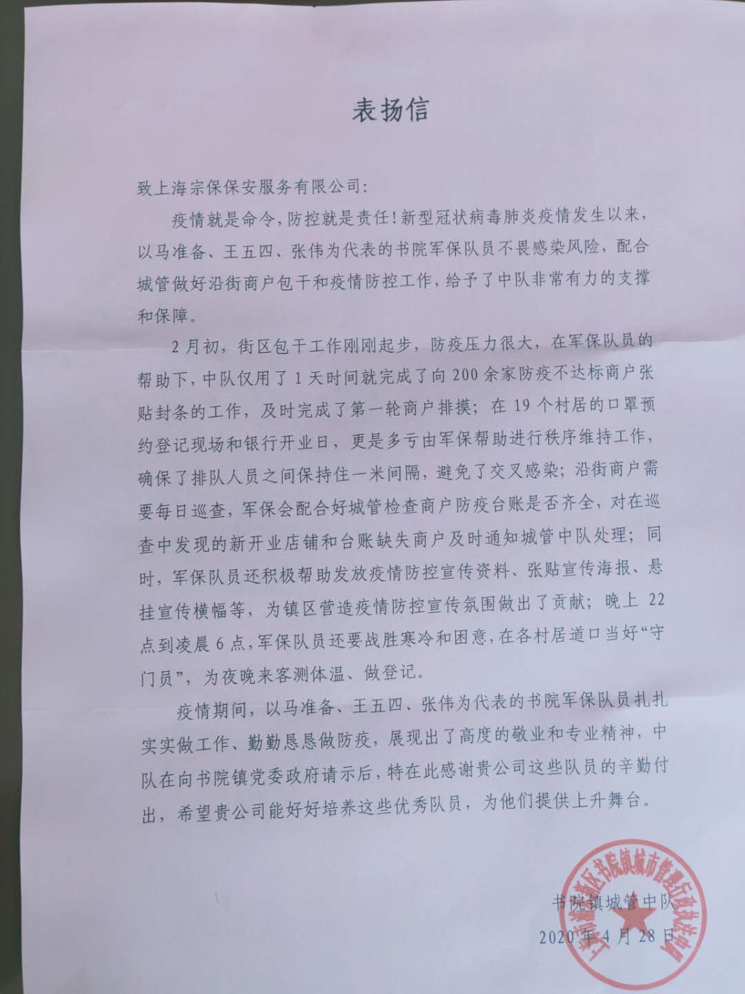 4月28日,宗保公司駐書(shū)院鎮(zhèn)市容項(xiàng)目收到書(shū)院鎮(zhèn)城管中隊(duì)中隊(duì)長(zhǎng)王燕偉送來(lái)的一封表?yè)P(yáng)信,信中對(duì)以馬準(zhǔn)備、王五四、張偉等為代表的書(shū)院鎮(zhèn)市容項(xiàng)目隊(duì)員,在防控新冠肺炎疫情中配合城管中隊(duì)所做的工作,提供的有力支撐和保障提出表?yè)P(yáng)。