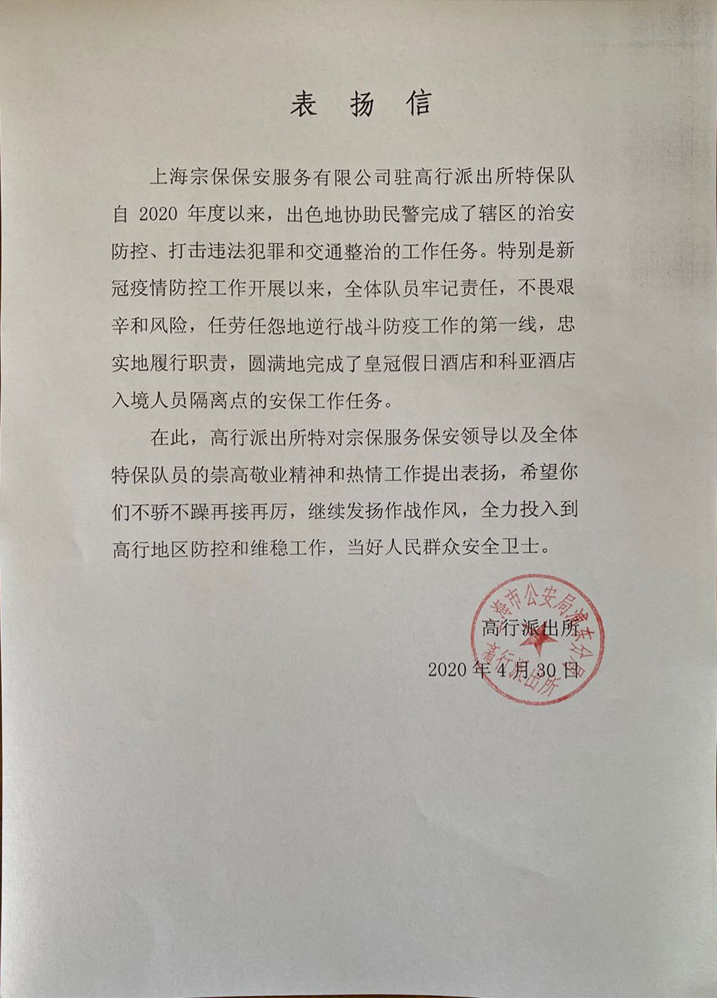 4月30日,高行輔警項(xiàng)目收到浦東公安分局高行派出所送來(lái)的一封表?yè)P(yáng)信,信中對(duì)高行輔警項(xiàng)目全體隊(duì)員在疫情防控中的努力和辛勤付出提出表?yè)P(yáng)。