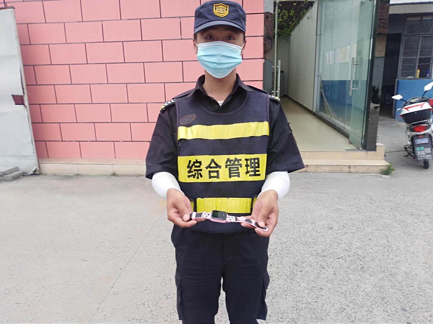 5月24日17點,宗保公司駐三林市容項目隊員范金元巡邏至高青路地鐵站附近時,發(fā)現(xiàn)一塊學生用智能手表,可能是附近小朋友放學路上不小心遺失的,肯定會打電話過來。因手表有定位功能,小范不想失主跑太多路,就在原地等待。