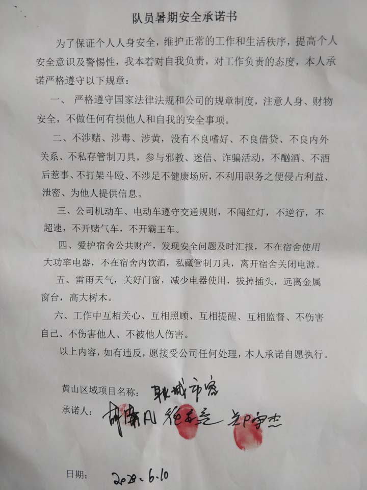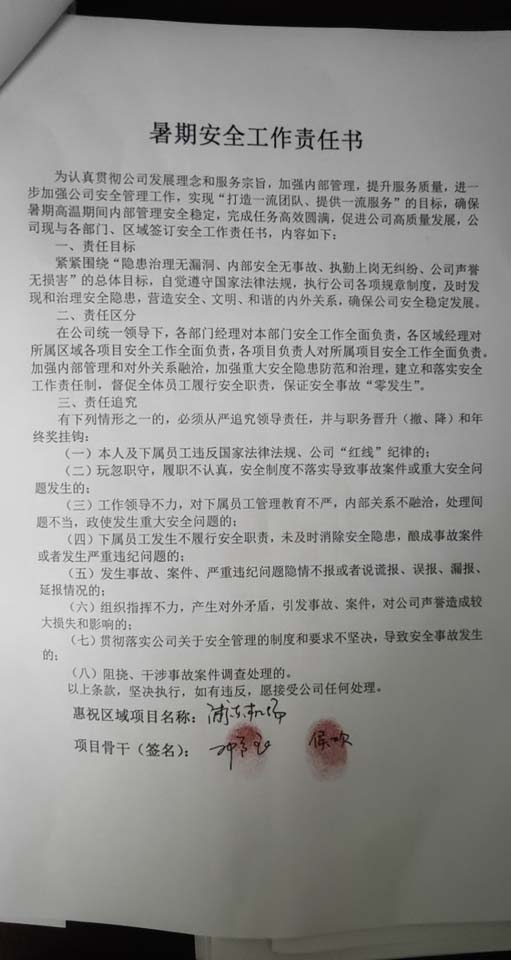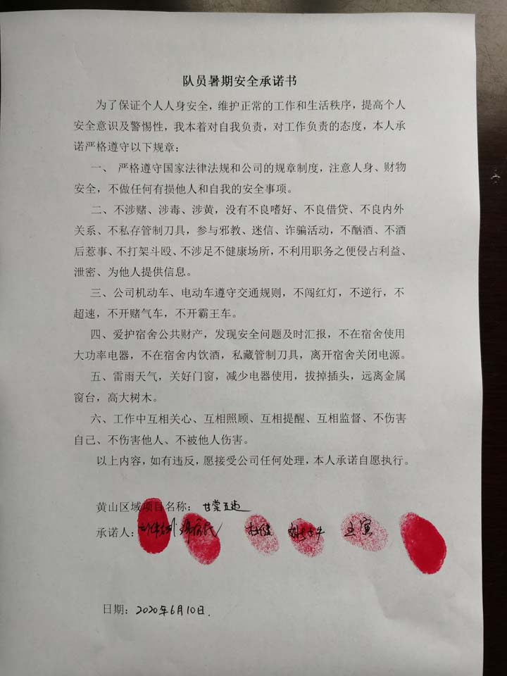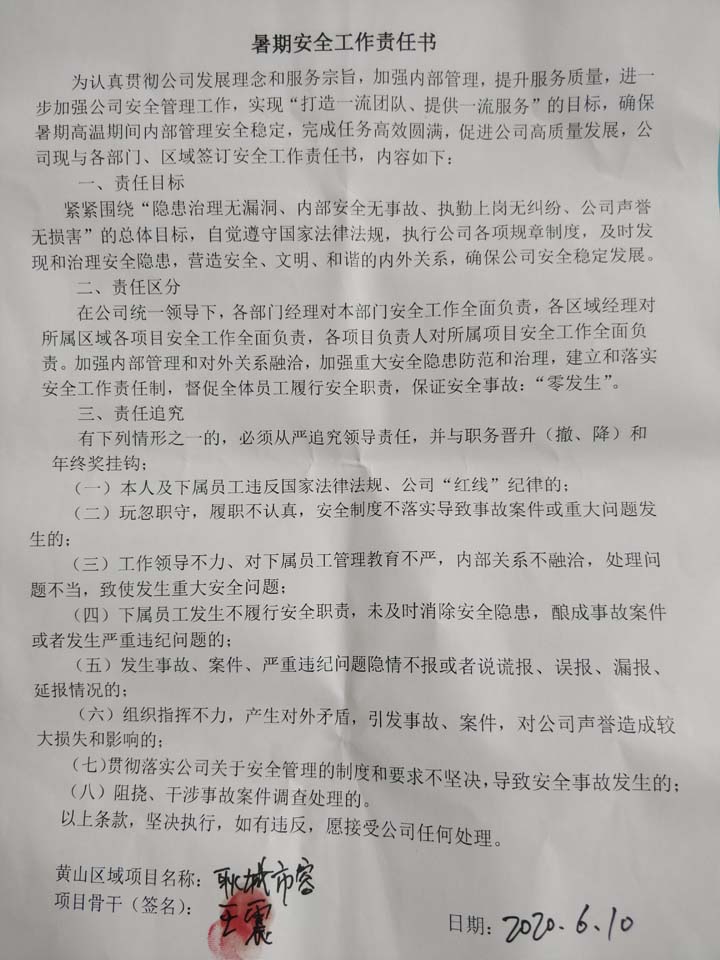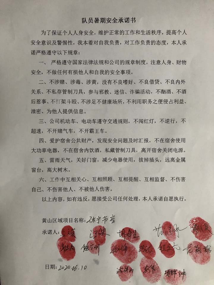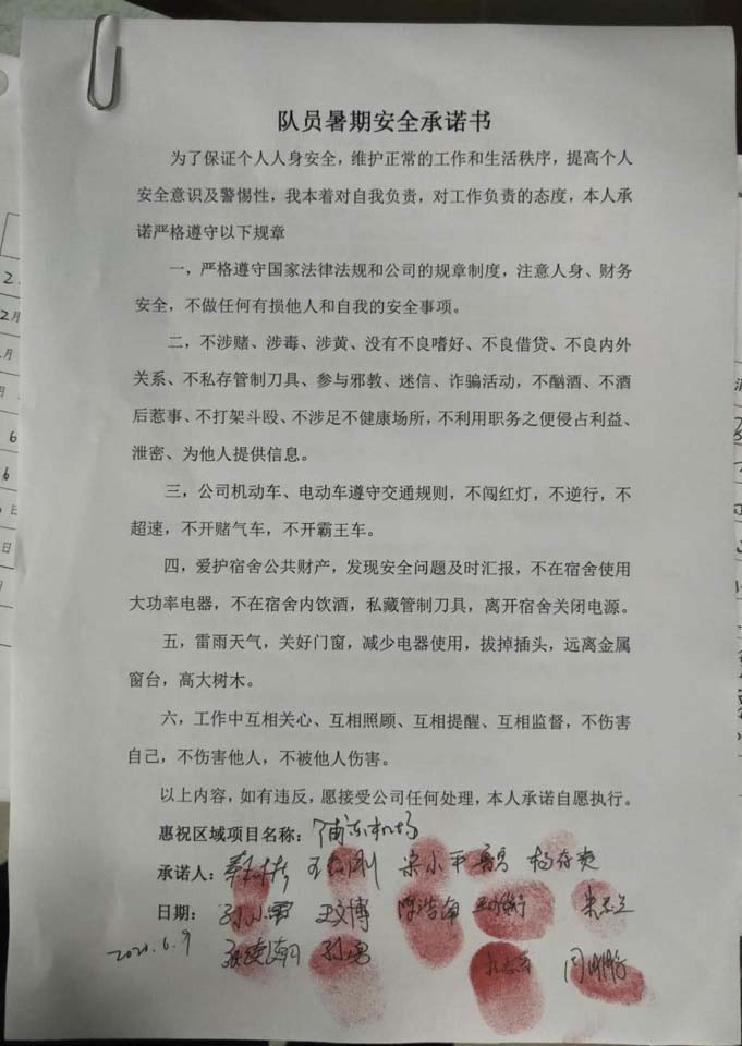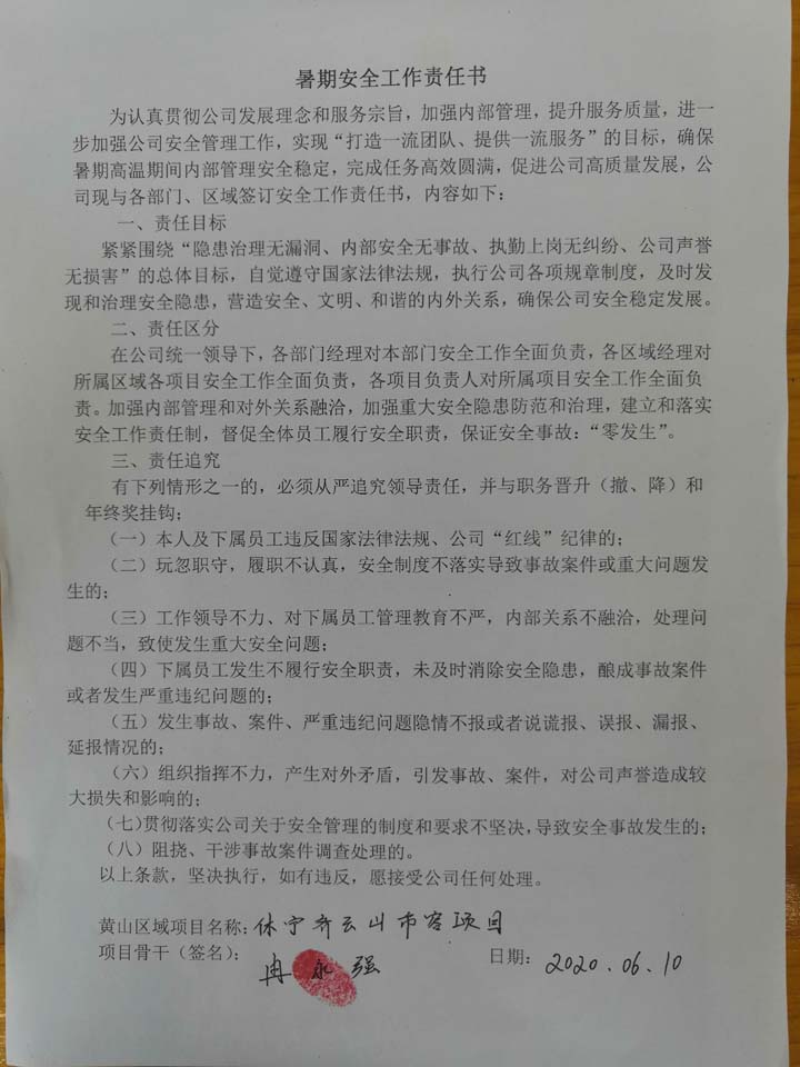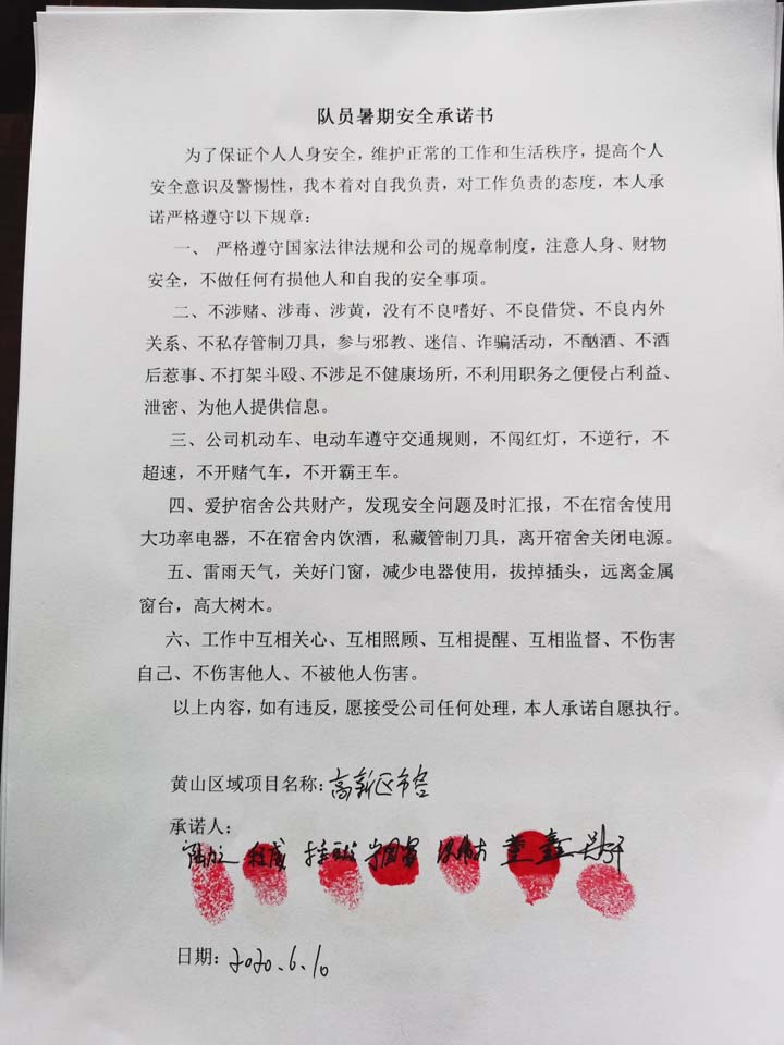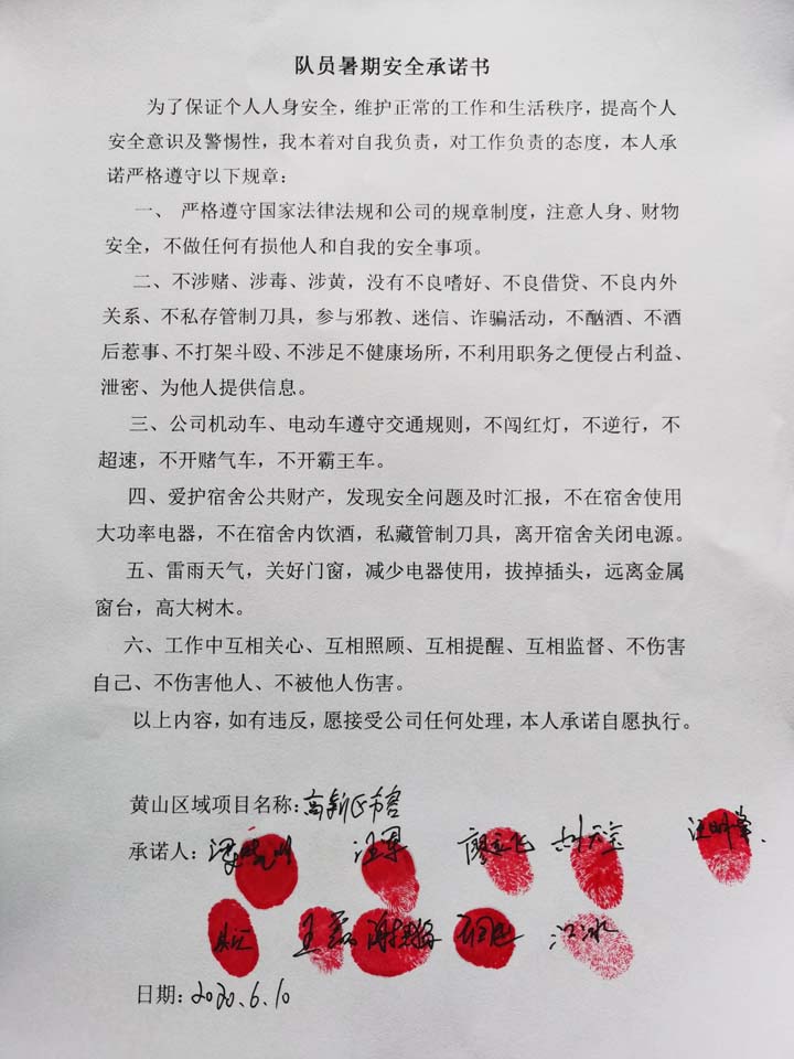 全體員工認(rèn)真學(xué)習(xí)領(lǐng)會公司暑期安全工作部署會精神,思想上高度重視,行動上堅(jiān)定自覺,各項(xiàng)目骨干帶頭與隊(duì)員簽訂暑期安全承諾書,強(qiáng)化責(zé)任意識,筑牢安全防線,堅(jiān)守安全底線,確保平穩(wěn)度夏。