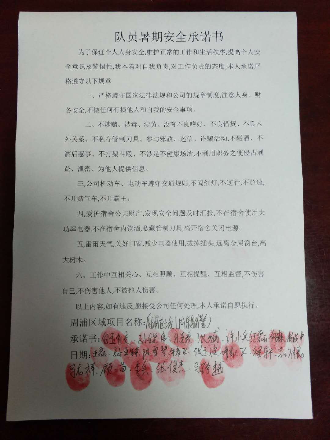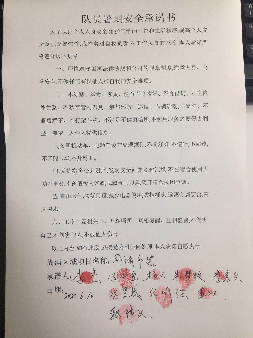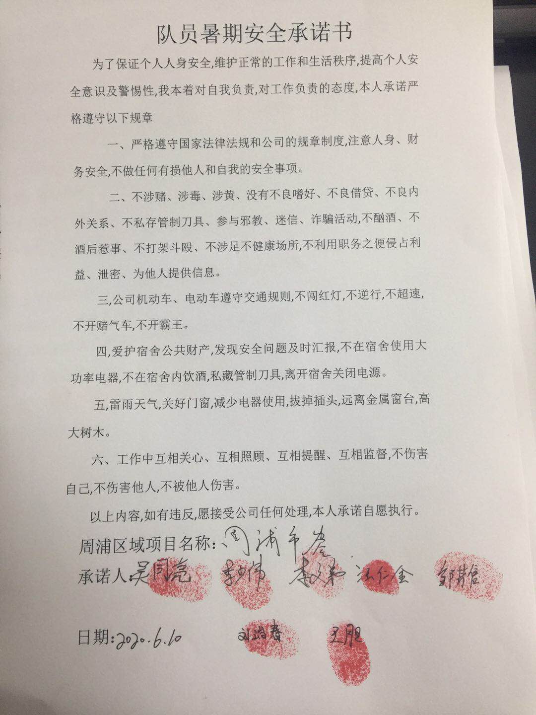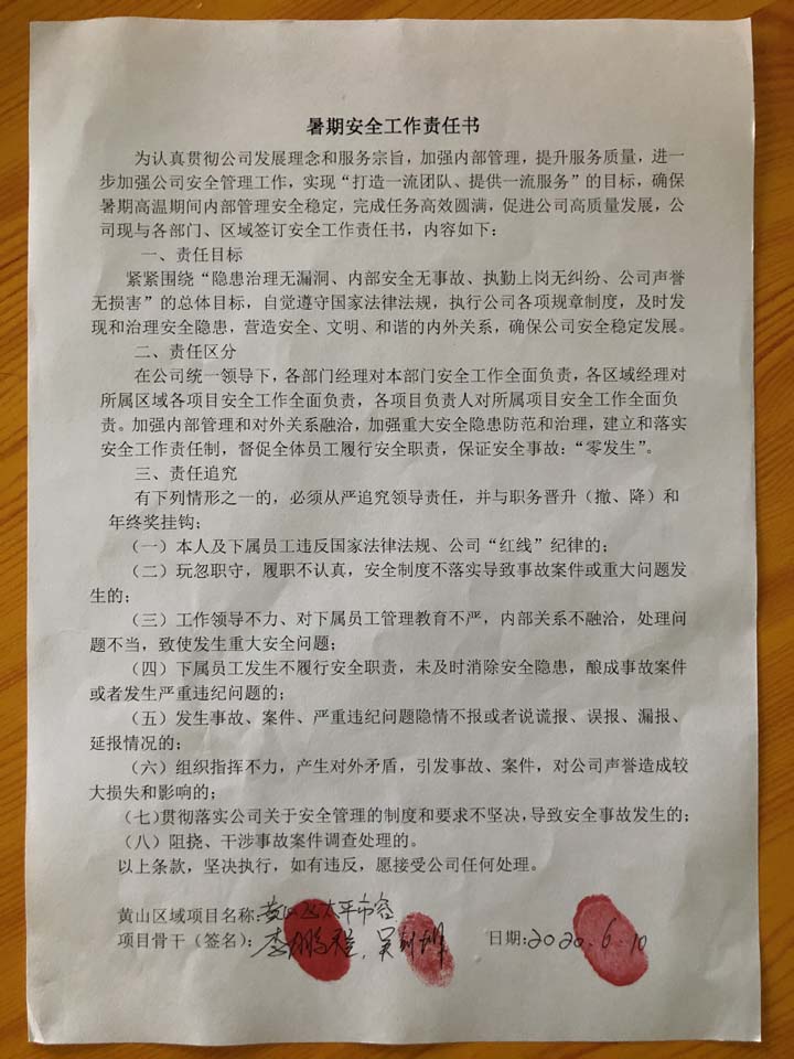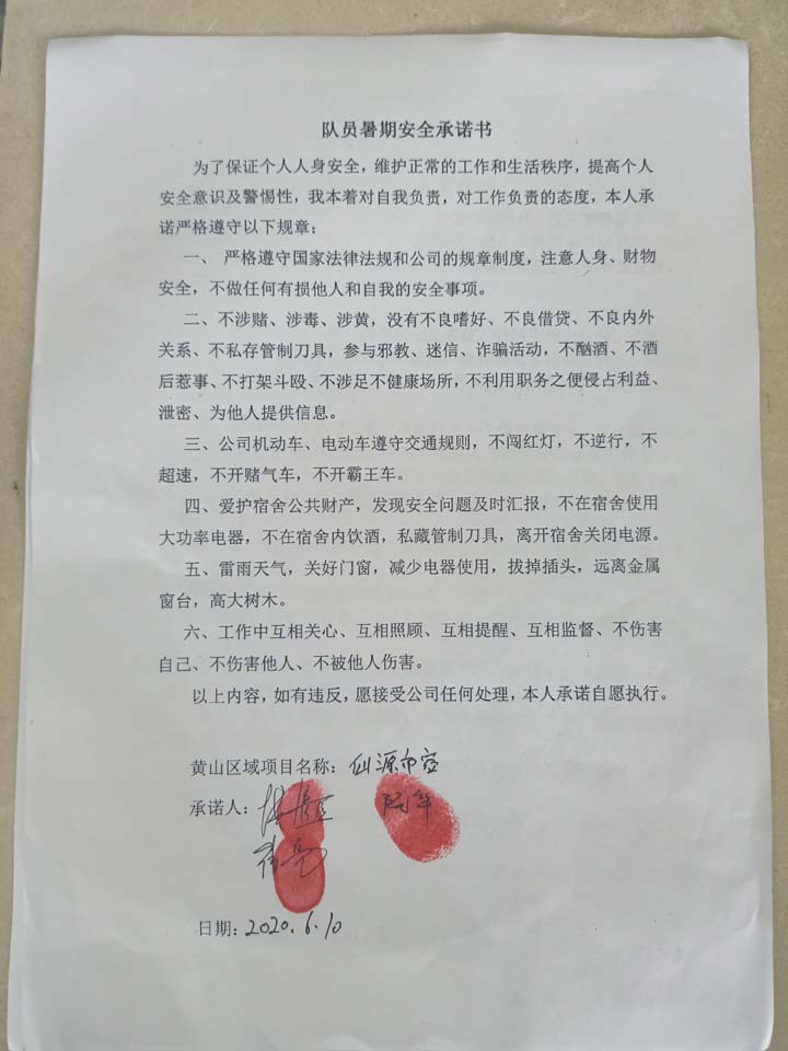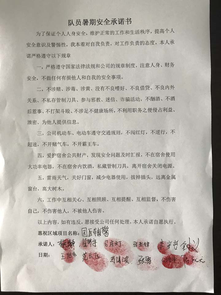 全體員工認(rèn)真學(xué)習(xí)領(lǐng)會公司暑期安全工作部署會精神,思想上高度重視,行動上堅(jiān)定自覺,各項(xiàng)目骨干帶頭與隊(duì)員簽訂暑期安全承諾書,強(qiáng)化責(zé)任意識,筑牢安全防線,堅(jiān)守安全底線,確保平穩(wěn)度夏。