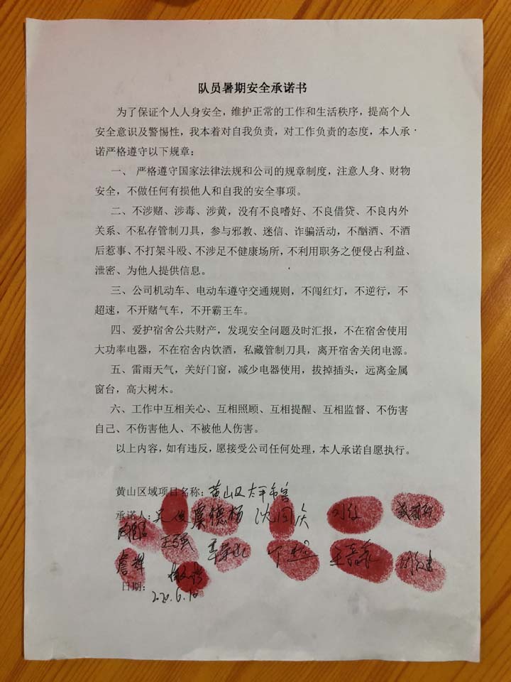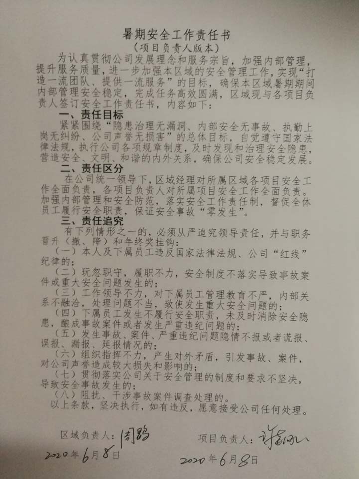 6月15日,閔行區(qū)域經(jīng)理周鹍組織召開本區(qū)域骨干安全工作會議,結合閔行區(qū)域的實際情況,制定安全工作實施方案,參照公司下發(fā)的“十查十防”一覽表進行自查自糾,逐項梳理、查漏補缺。對本項目自身難以解決的安全隱患,及時上報區(qū)域經(jīng)理,并與每位隊員簽訂安全防范責任書,切實提高所有隊員的安全防范意識。
